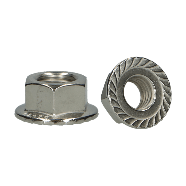 Corrosiebestendig, geschikt voor vochtige en buitenomgevingen Zelfborgend door vertanding onder de flens RVS A2 flensmoeren met vertanding worden gebruikt in situaties waar trillingsvaste bevestiging De flens verdeelt de kracht over een groter oppervlak waardoor er een betere spreiding is van de druk Dankzij de flens kunnen overmaatse gaten of sleufgaten worden overbrugd en roestbestendigheid nodig zijn, zoals : Machine en apparatenbouw, Metaalconstructies en plaatwerk, Voertuigtechniek, trailers en landbouwmachines