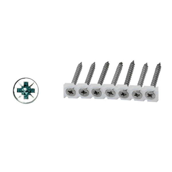 Omschrijving Deze bandspaanplaatschroeven staan voor snel werken, sterke verbindingen en een strak resultaat, dé keuze voor elke professionele afbouwer of interieurbouwer.Dankzij de bandverpakking kunnen schroeven snel en efficiënt worden verwerkt, ideaal voor serie en montagewerk. De verzinkte coating biedt een betrouwbare corrosiebescherming en een nette uitstraling. De bandschroeven zijn voorzien van een waxlaag voor een lager indraaimoment De schroefdraad begint aan de tip van de punt voor een optimale grip in het hout Met hun scherpe punt en grove draad grijpen deze schroeven direct in spaanplaat, MDF of zachthout zonder voorboren. De platte kop met Pozidrive aansluiting zorgt voor een vlakke verzinking en uitstekende krachtoverbrenging Toepassing:Perfect geschikt voor het monteren van spaanplaten,schuttingdelen interieurafwerking, meubelbouw en montagewerk met schroefautomaten. Bandspaanplaatschroeven Pozidrive op kunststof strip van 50 stuks Geschikt voor schroefautomaten van o.a Milwaukee, Hikoki, Makita, Senco etc
