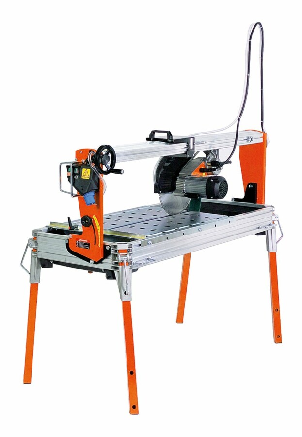 Kenmerken Handwiel: Handwiel om de zaagkop te bewegen. Brug: Rail gemaakt van geëxtrudeerd aluminium met een hoge weerstand tegen torsiestress. Uitgerust met stalen kogellagers die lopen op verwisselbare strips van roestvrij staal. Absolute snijprecisie. Frame: Gemaakt van geëxtrudeerd aluminium voor maximale stabiliteit en minimaal gewicht, voorzien van 4 handgrepen voor het verplaatsen en transport. Schaalverdeling : in millimeters voor snelle uitvoering van de sneden in serie. Aandrijfmotor : De aandrijfmotor glijdt met 8 kogellagers over de verwisselbare roestvrijstalen rails Kantelbare zaagkop: zaagkop kantelbaar voor verstekzagen tot 45°. Werkbank : Langere tegels zagen wordt mogelijk i.c.m. de Multi Bench.