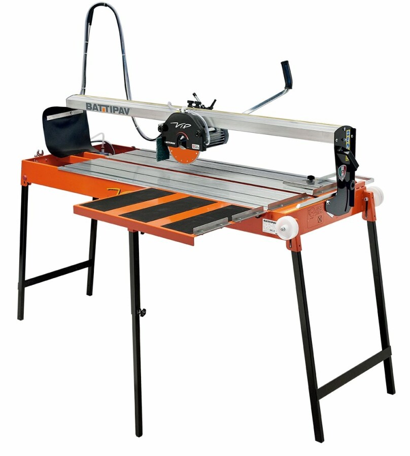 Kenmerken Kantelbare zaagkop : Kan worden vergrendeld op de gewenste hoogte. Goniometer : een professionele verstelbare goniometer is inbegrepen Verlengde zijbank : de Vip-serie heeft een eigen optionele zijbank, deze is zeer praktisch wanneer er grotere tegels gesneden moeten worden. Aandrijfmotor : De aandrijfmotor glijdt met 8 kogellagers over de verwisselbare roestvrijstalen rails Transportwielen : Voorzien van 2 transportwielen voor het verplaatsen en transport.