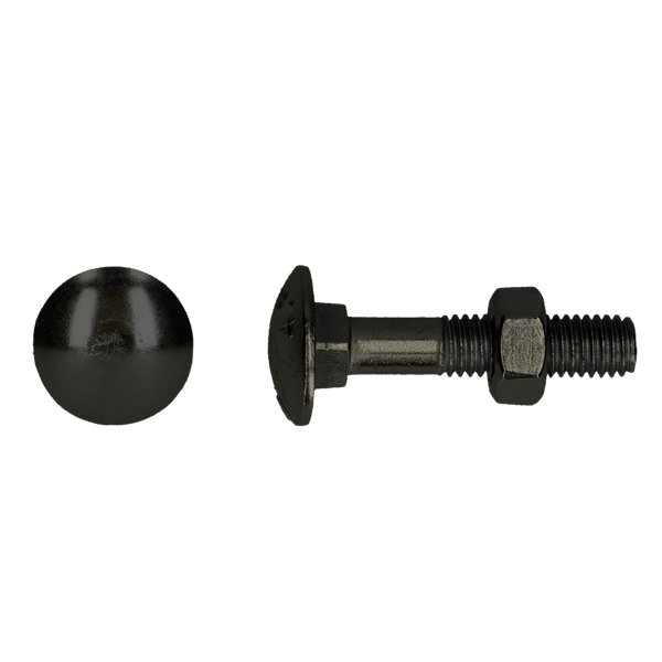 Din 603 / 555 Standaard bout/moercombinatie Staalkwaliteit 4.8 Solide voor algemene toepassingen Zwarte coating moderne uitstraling + extra corrosiebescherming Vierkante nok voorkomt meedraaien bij montage Esthetisch en functioneel perfect voor zichtwerk Toepassingen : meubelbouw, hekwerken, interieurbouw, houtconstructies, zichtbare verbindingen.
