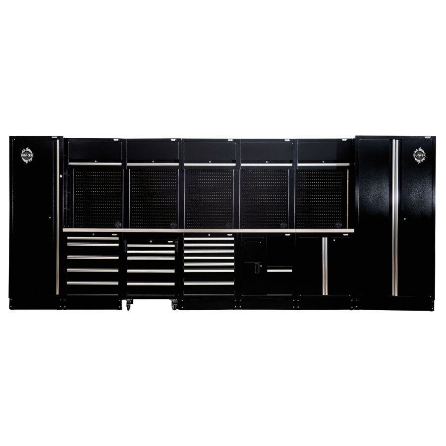 De Bunker opbergcombinatie type D043091 is een 25-delig modulair opbergsysteem met een geïntegreerde gootsteenmodule en een duurzaam roestvaststalen werkblad.