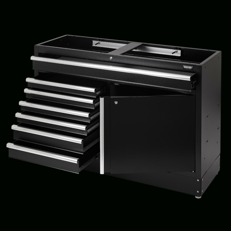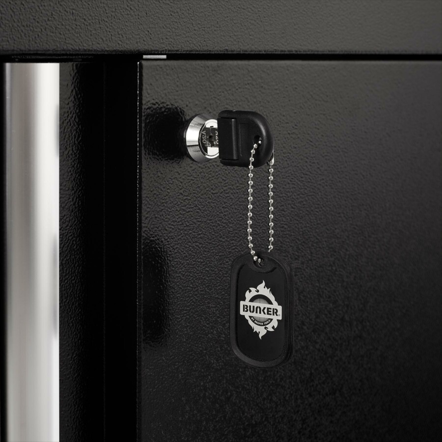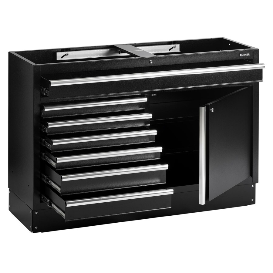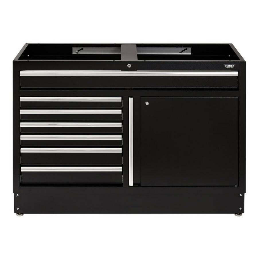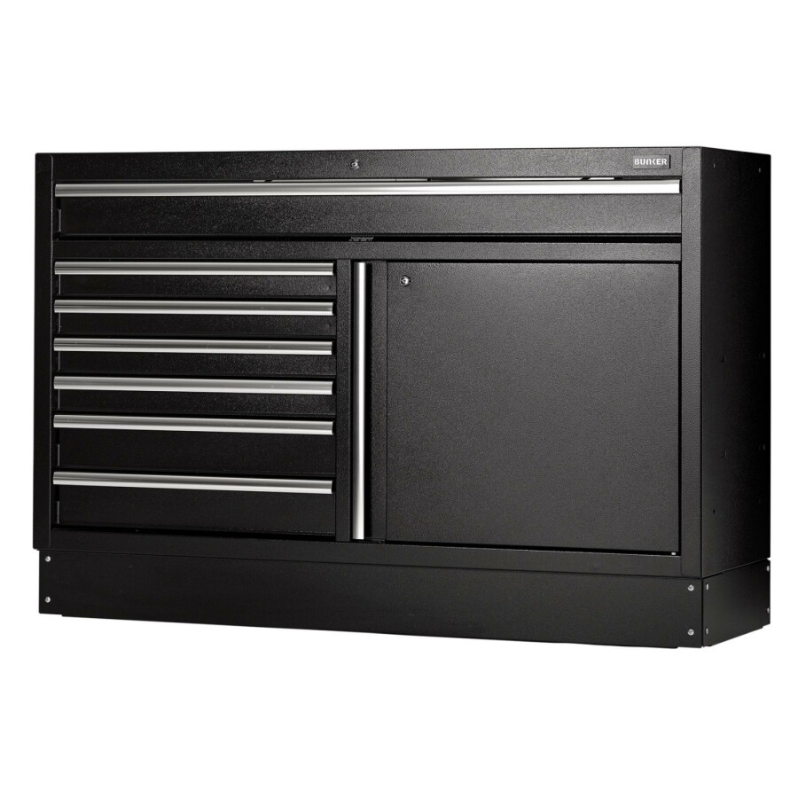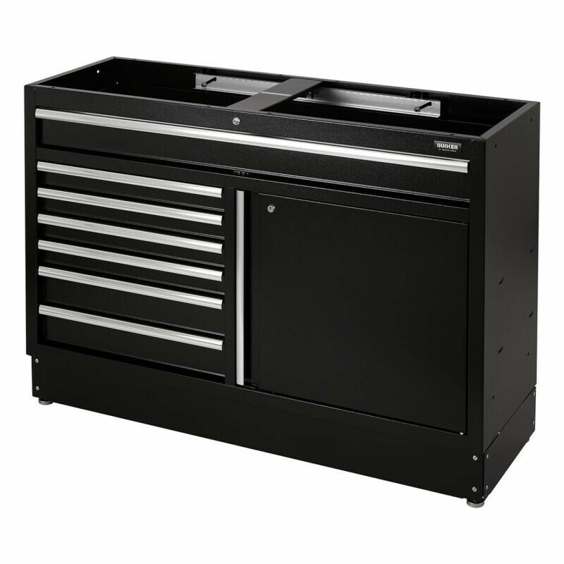 Dit prachtig ontworpen meubel van hoogwaardig staal heeft zeven lades verfraaid met stijlvolle aluminium handgrepen. Elke lade heeft een soepele softclose-bediening en is bekleed met weelderig schuim om je gereedschap te beschermen. Er is een kast met uitstekende opbergruimte met een verstelbare plank, toegankelijk via een enkele kastdeur met aluminium handgreep. De poten van de kast zijn verstelbaar voor een optimale positionering op een ongelijke vloer. De matzwarte structuurafwerking van de kast is zeer duurzaam dankzij de industriële poedercoating die beschermt tegen krassen, slijtage en corrosie. Het heeft een integraal slot voor veiligheid en wordt geleverd met twee sleutels. De kast wordt volledig gemonteerd geleverd en heeft de afmetingen Breed 1360 x Hoog 910 x Diep 468 mm. Het kan worden gebruikt als een individuele opbergkast in combinatie met een roestvrijstalen of hardhouten werkblad of als onderdeel van het Bunker® modulaire opbergsysteem, dat 24 slimme modulaire opties omvat. Het wordt geleverd met alle benodigde fittingen voor een eenvoudige installatie. Voor uw kwaliteitsborging hebben alle Bunker®-units een garantie van 10 jaar.