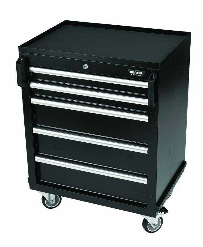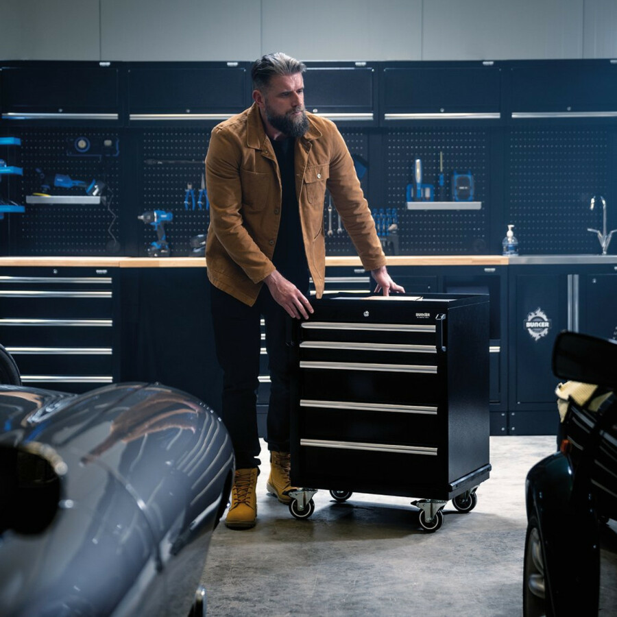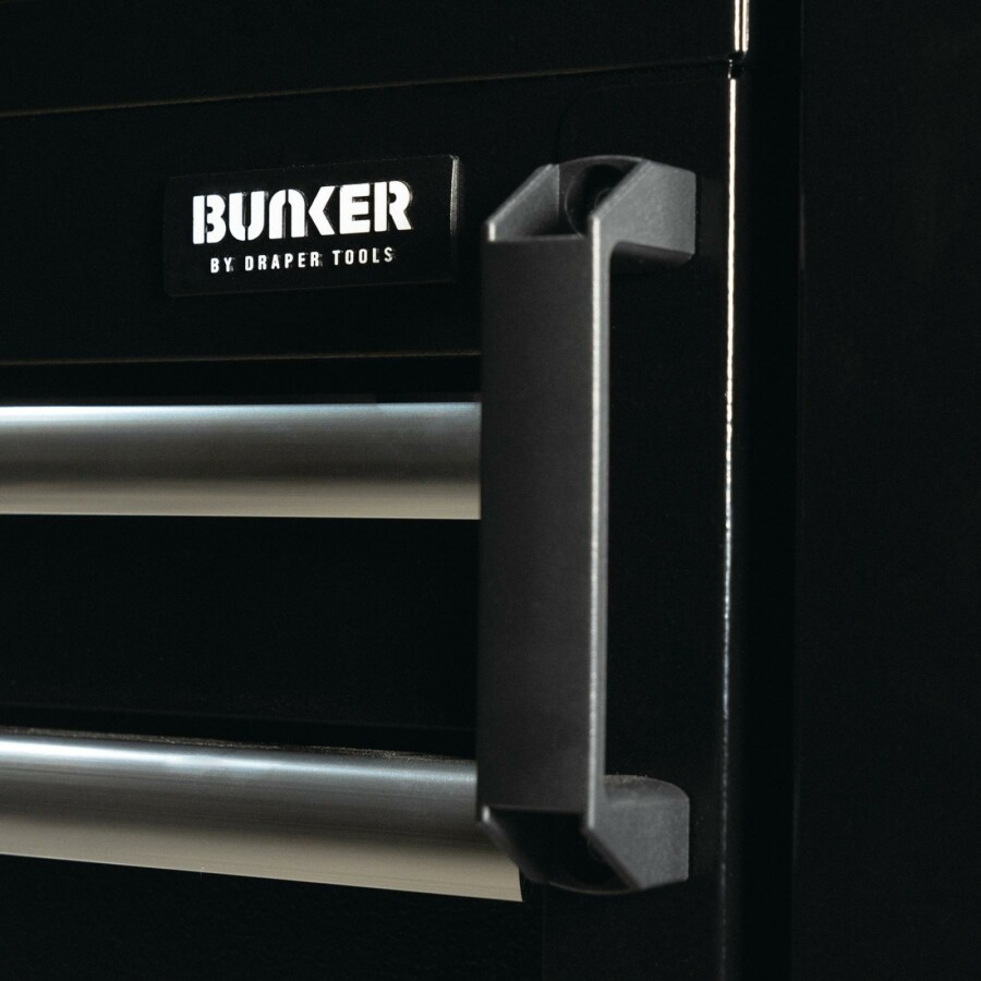 Dit prachtig ontworpen meubel van hoogwaardig staal heeft vijf lades verfraaid met stijlvolle aluminium handgrepen. Elke lade heeft een soepele softclose bediening en is bekleed met weelderig schuim om je gereedschap te beschermen. De matzwarte structuurafwerking van de kast is zeer duurzaam dankzij de industriële poedercoating die beschermt tegen krassen, slijtage en corrosie. Dit is een verrijdbare kast, zodat je nuttige spullen bij de hand hebt waar je ze ook nodig hebt in je garage. Zodra u klaar bent om op te ruimen, rolt u het terug naar zijn positie in uw modulaire opbergeenheid. Er zijn twee sterke kunststof handgrepen aan de voorkant van het apparaat en vier duurzame zwenkwielen voor gemakkelijke wendbaarheid. twee zijn uitgerust met remmen. Het heeft een integraal slot voor veiligheid en wordt geleverd met twee sleutels. De kast wordt volledig gemonteerd geleverd en heeft de afmetingen Breed 646 x Hoog 862 x Diep 458 mm. Het kan worden gebruikt als een individuele opbergkast of als onderdeel van het Bunker® modulaire opbergsysteem, dat 24 slimme modulaire opties omvat. Voor uw kwaliteitsborging hebben alle Bunker®-units een garantie van 10 jaar.
