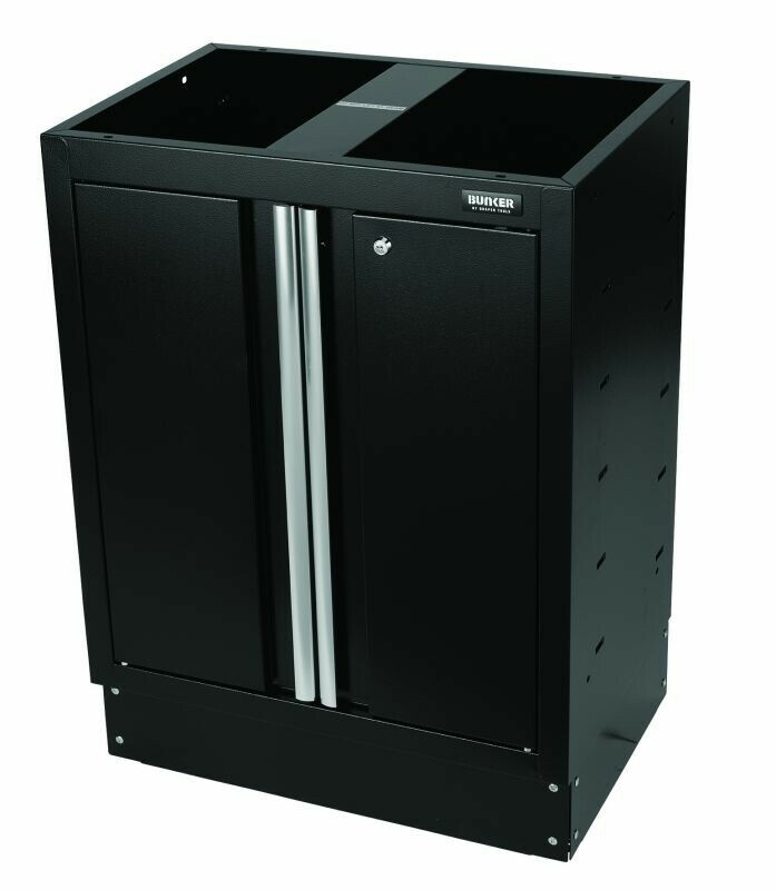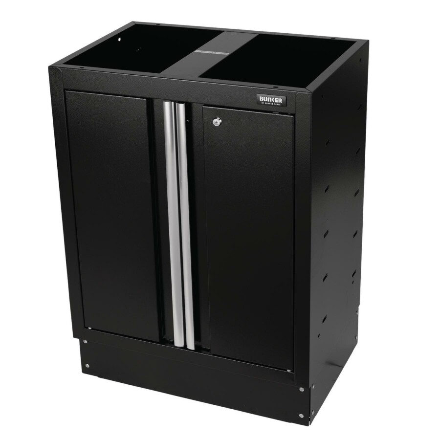 Bunker® modulaire vloerkast met 2 deuren. Dit prachtig vormgegeven meubel van hoogwaardig staal biedt uitstekende opbergruimte die toegankelijk is via twee kastdeuren met stijlvolle aluminium handgrepen. De verstelbare plank aan de binnenkant zorgt voor een veelzijdiger gebruik van de ruimte. De poten van de kast zijn verstelbaar voor een optimale positionering op een ongelijke vloer. De matzwarte structuurafwerking van de kast is zeer duurzaam dankzij de industriële poedercoating die beschermt tegen krassen, slijtage en corrosie. Het heeft een integraal slot voor veiligheid en wordt geleverd met twee sleutels. De kast wordt volledig gemonteerd geleverd en heeft de afmetingen Breed 680 x Hoog 910 x Diep 458 mm. Het kan worden gebruikt als een individuele opbergkast in combinatie met een roestvrijstalen of hardhouten werkblad of als onderdeel van het Bunker® modulaire opbergsysteem, dat 24 slimme modulaire opties omvat. Het wordt geleverd met alle benodigde fittingen voor een eenvoudige installatie. Voor uw kwaliteitsborging hebben alle Bunker®-units een garantie van 10 jaar.