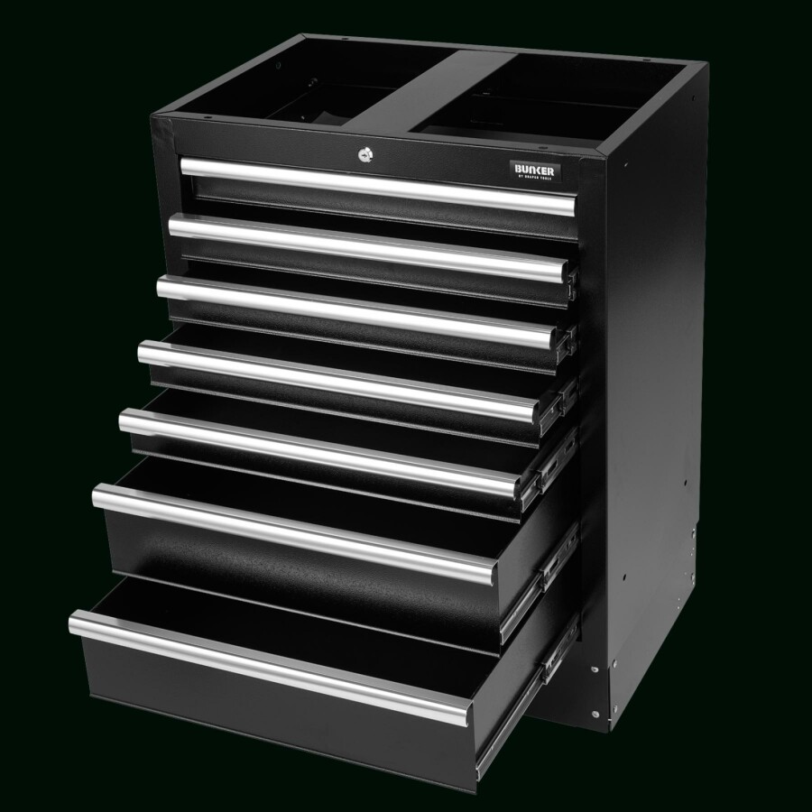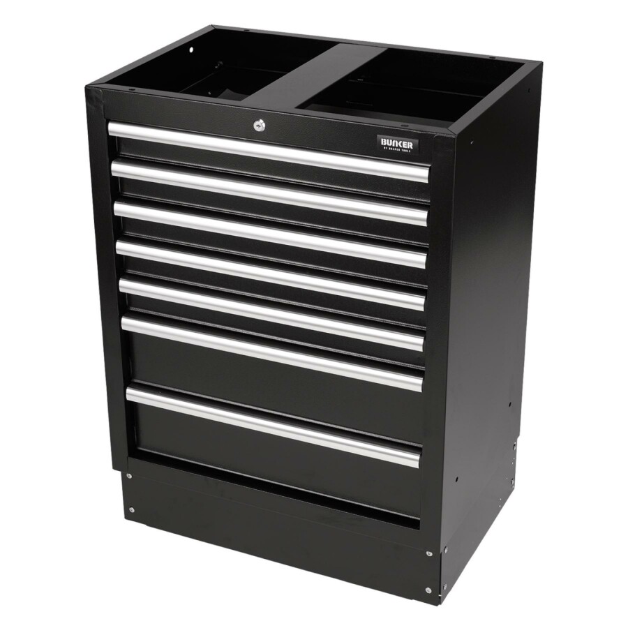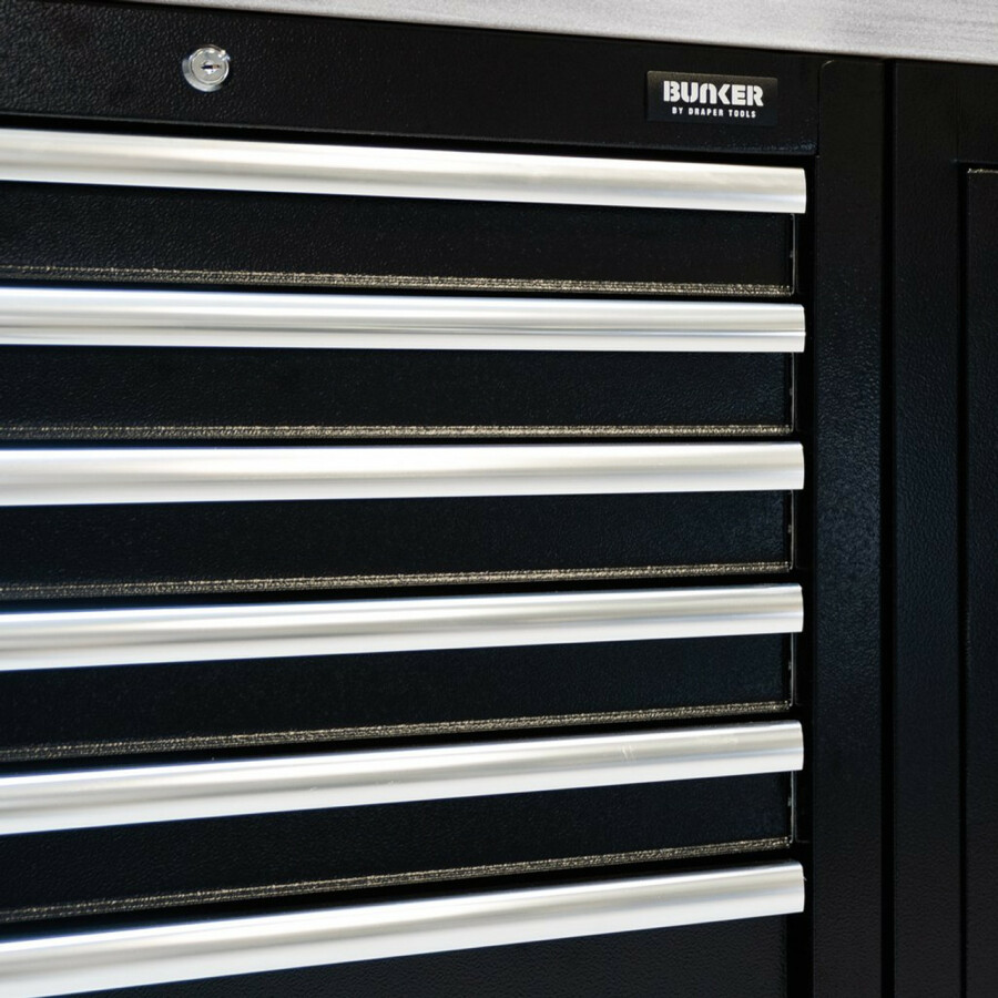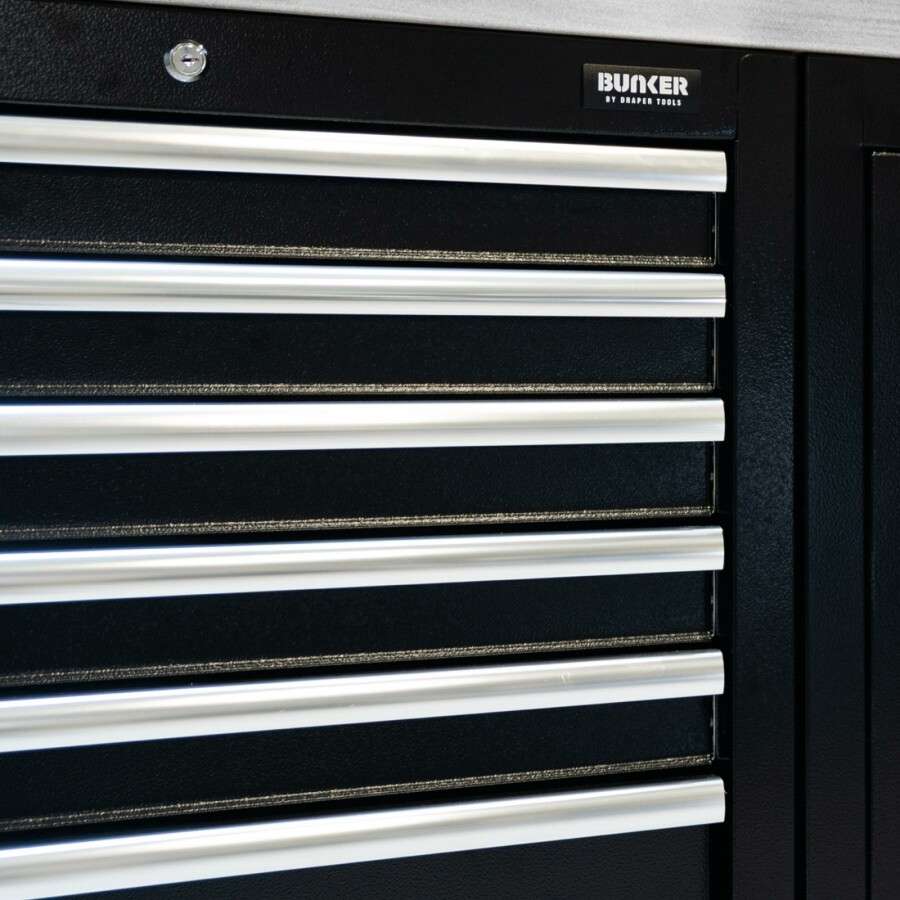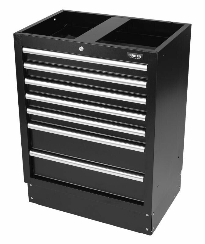 Dit prachtig ontworpen meubel van hoogwaardig staal heeft zeven lades verfraaid met stijlvolle aluminium handgrepen. Elke lade heeft een soepele softclose-bediening en is bekleed met weelderig schuim om je gereedschap te beschermen. De poten van de kast zijn verstelbaar voor een optimale positionering op een ongelijke vloer. De matzwarte structuurafwerking van de kast is zeer duurzaam dankzij de industriële poedercoating die beschermt tegen krassen, slijtage en corrosie. Het heeft een integraal slot voor veiligheid en wordt geleverd met twee sleutels. De kast wordt volledig gemonteerd geleverd en heeft de afmetingen Breed 680 x Hoog 910 x Diep 458 mm. Het kan worden gebruikt als een individuele opbergkast in combinatie met een roestvrijstalen of hardhouten werkblad of als onderdeel van het Bunker® modulaire opbergsysteem, dat 24 slimme modulaire opties omvat. Het wordt geleverd met alle benodigde fittingen voor een eenvoudige installatie. Voor uw kwaliteitsborging hebben alle Bunker®-units een garantie van 10 jaar.