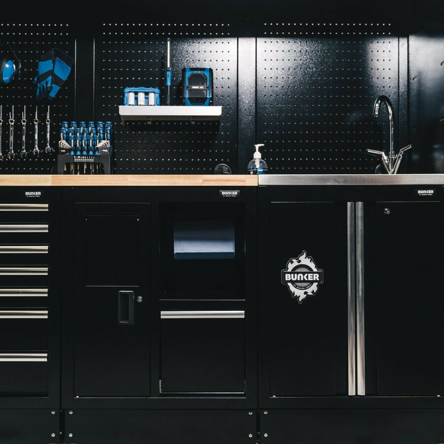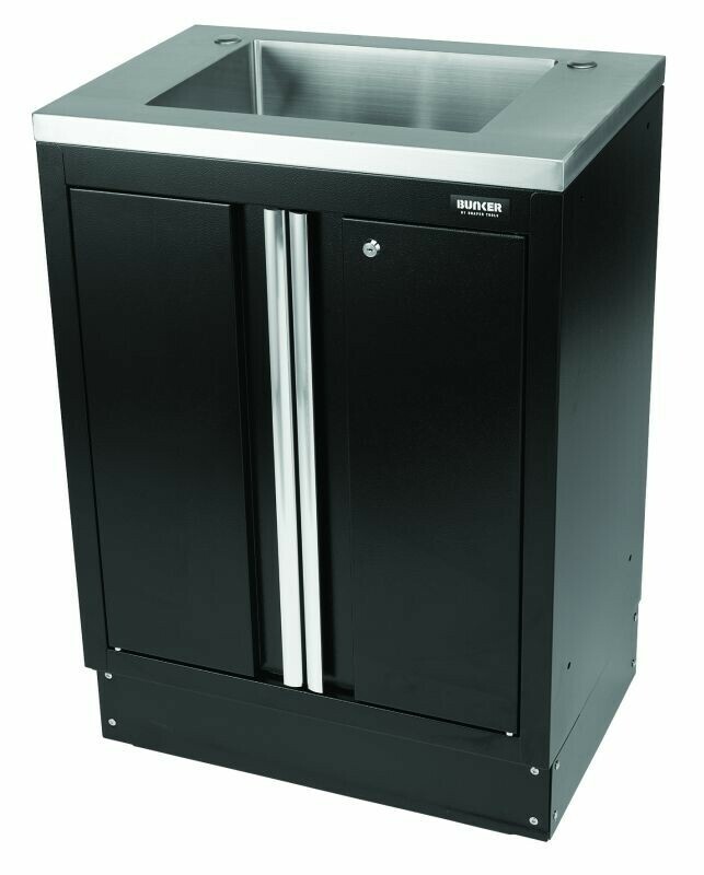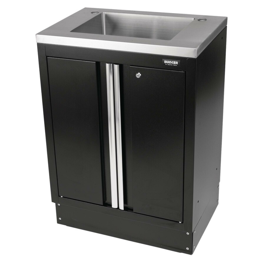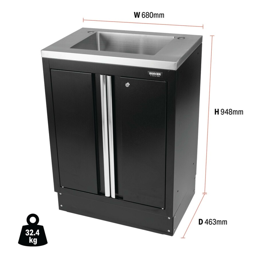 Bunker modulaire hoge vloerkast met gootsteen en 2 deuren 680 mm nr. D31034 Onderdeel van het Bunker® modulaire opbergsysteem. Dit prachtig vormgegeven hoogwaardige stalen meubel is voorzien van een RVS spoelbak en twee kastdeuren met aluminium handgrepen die toegang geven tot de grote bergruimte eronder. De verstelbare plank aan de binnenkant zorgt voor een veelzijdiger gebruik van de ruimte. De poten van de kast zijn verstelbaar voor een optimale positionering op een ongelijke vloer. De matzwarte structuurafwerking van de kast is zeer duurzaam dankzij de industriële poedercoating die beschermt tegen krassen, slijtage en corrosie. Het heeft een integraal slot voor veiligheid en wordt geleverd met twee sleutels. De kast wordt volledig gemonteerd geleverd en heeft de afmetingen Breed 680 x Hoog 948 x Diep 463 mm. Het kan worden gebruikt als een individuele opbergkast of als onderdeel van het Bunker® modulaire opbergsysteem, dat 24 slimme modulaire opties omvat. Het wordt geleverd met alle benodigde fittingen voor een eenvoudige installatie. Voor uw kwaliteitsborging hebben alle Bunker®-units een garantie van 10 jaar.