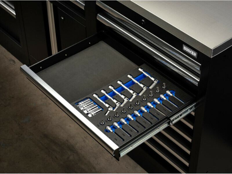Inlay: Slijtvaste, olie en chemicaliënbestendige foam met maatvaste uitsparingen en contrasterende onderlaag.