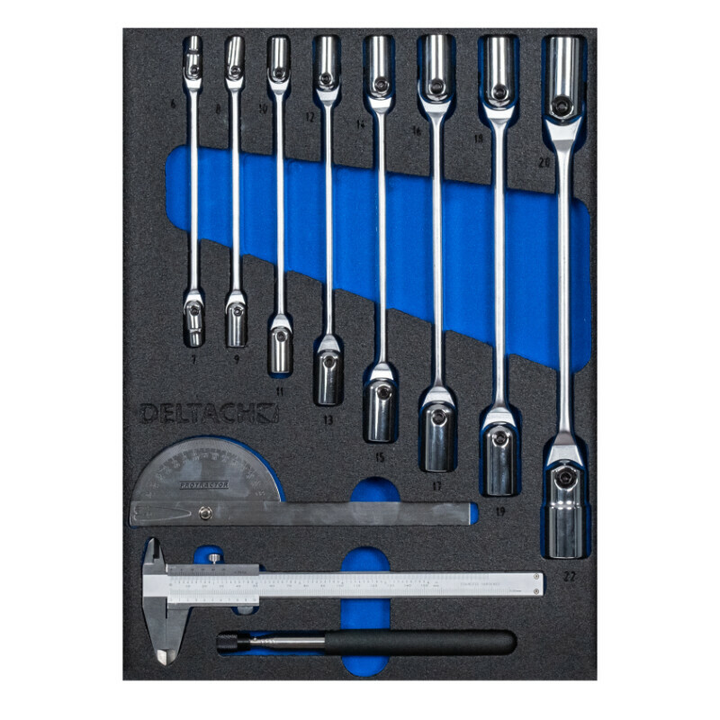 Omschrijving De Bunker Deltach inlay type 561024 combineert een kniesleutelset met een Meet & Pick Upset, ideaal voor werk in krappe motorruimtes, werkplaatsen of montageomgevingen. Alles is overzichtelijk opgeborgen in een duurzame foam inlay, passend in gereedschapswagens en laden. De kniesleutels bieden maximale bewegingsvrijheid dankzij de scharnierende koppen. De Meet- & Pick-Uptool zoals telescoopmagneet, maken het eenvoudig om metalen onderdelen op moeilijk bereikbare plekken op te sporen en op te pakken. Inhoud: Kniesleutels div. maten, telescoopmagneet, Gradenboog, Pick-Up tool Kniesleutels: Flexibele koppen, chroom-vanadiumstaal, verchroomd en gehard. Meet-/Pick-uptools: Uittrekbare en magnetische functie. Inlay: Slijtvaste, maatvaste foam met contrasterende onderlaag voor snelle visuele controle. Toepassing: Voor diagnose, onderhoud en herstelwerkzaamheden in automotive, techniek en industrie. Inhoud: Kniesleutels: 6x7 - 8x9 - 10x11 - 12x13 - 14x15 - 16x17 - 18x19 - 20x22 mm Schuifmaat Gradenboog Pickup tool