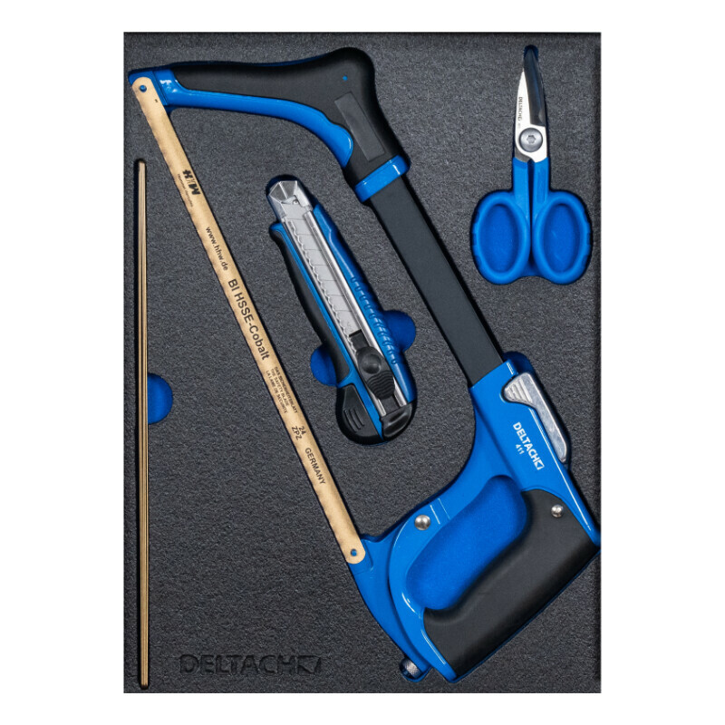 Omschrijving De Bunker Deltach inlay type 561022 bevat een complete zaag- en snijset, overzichtelijk opgeborgen in een duurzame, op maat gesneden foam inlay. Deze set is ideaal voor het nauwkeurig zagen en snijden van diverse materialen in een professionele werkomgeving. De gereedschappen zijn voorzien van ergonomische handgrepen en vlijmscherpe snijbladen voor moeiteloos en veilig werken. De inlay houdt alles stevig op zijn plek en maakt snel zichtbaar wanneer een onderdeel ontbreekt. Inhoud: Metaalzaag, precisiezaag, reservemessen, afbreekmessen, tapijt-/veiligheidsmes e.a. Materialen: Hoogwaardige stalen bladen met ergonomische, slipvaste handgrepen. Inlay: Slijtvaste en chemisch bestendige foam met contrasterende onderlaag voor snelle visuele controle. Veiligheid: Gereedschappen veilig opgeborgen, messen afgedekt in de foamuitsparingen. Toepassing: Voor montage, bouw, installatietechniek, automotive en algemeen onderhoud. Inhoud : Zaagbeugel 300 mm , Schaar en afbreekmes Inclusief 4 extra zaagbladen en 4 mes navullingen