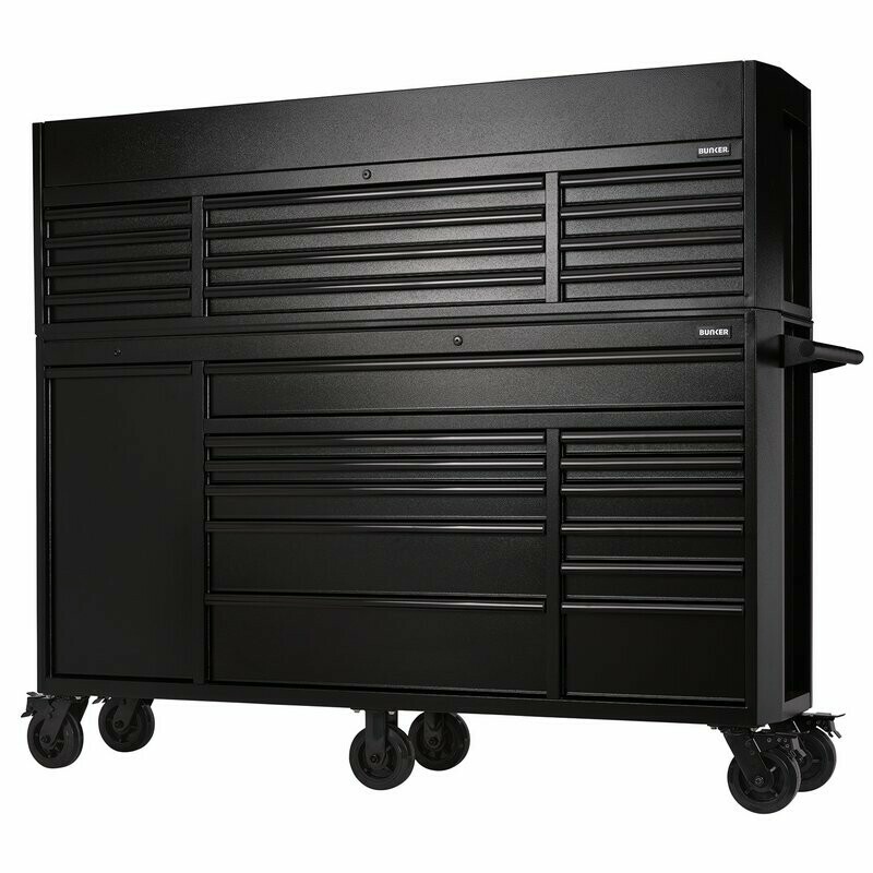 Omschrijving Bunker gecombineerde rolkast en gereedschapskist met 13 laden, 52" Verbeter de vorm en functie van uw garage of werkplaats met de 52" 132 cm Bunker gecombineerde rolkast en gereedschapskist. Verkrijgbaar in blauw, groen, zwart of grijs, combineert deze duurzame unit stijl naadloos met uitzonderlijke functionaliteit. Gemaakt van hoogwaardig staal en afgewerkt met een industriële poedercoating en zwart geanodiseerde aluminium accenten, is hij gebouwd om lang mee te gaan. Deze gereedschapskist beschikt over 13 laden, elk voorzien van een softclose-mechanisme voor een stille werking en een schuimvoering om uw gereedschap te beschermen. Het deksel van de kist opent soepel en gecontroleerd dankzij twee stille gasveren. Voor extra functionaliteit bieden twee rubberen doorvoeropeningen gemakkelijke toegang voor kabels, ideaal voor het opladen van gereedschap. of het rechtstreeks voeden van apparatuur vanuit de kast.