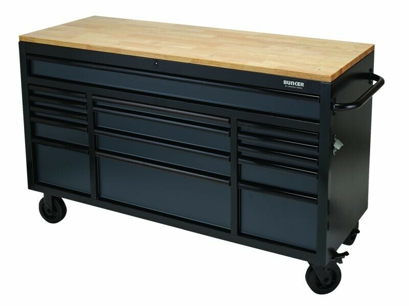 Omschrijving De 155 cm brede Bunker werkbank met verrijdbare gereedschapskast heeft 15 laden en biedt een professionele opbergoplossing. Deze verrijdbare gereedschapskast heeft 15 ruime laden met een soft-close mechanisme voor een stille werking en bescherming van uw gereedschap. De laden zijn afgewerkt met een stijlvolle geanodiseerde aluminium rand en de kast zelf heeft een gestructureerde afwerking voor extra duurzaamheid tegen krassen en dagelijkse slijtage. Elke lade is bekleed met schuim om gereedschap te beschermen en georganiseerd te houden. De vier zwenkwielen en de stalen handgreep aan de zijkant van de kast maken het verplaatsen en transporteren moeiteloos. Twee van de wielen zijn voorzien van remmen voor extra stabiliteit. Naast de royale opbergruimte is het 25 mm dikke hardhouten werkblad van de kast handig voor diverse dagelijkse klussen. Ervaar het verschil dat Bunker kan maken voor uw werkplek en ontdek ons online netwerk van erkende verkooppunten.
