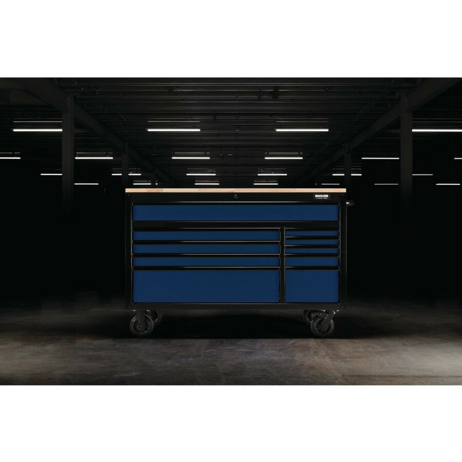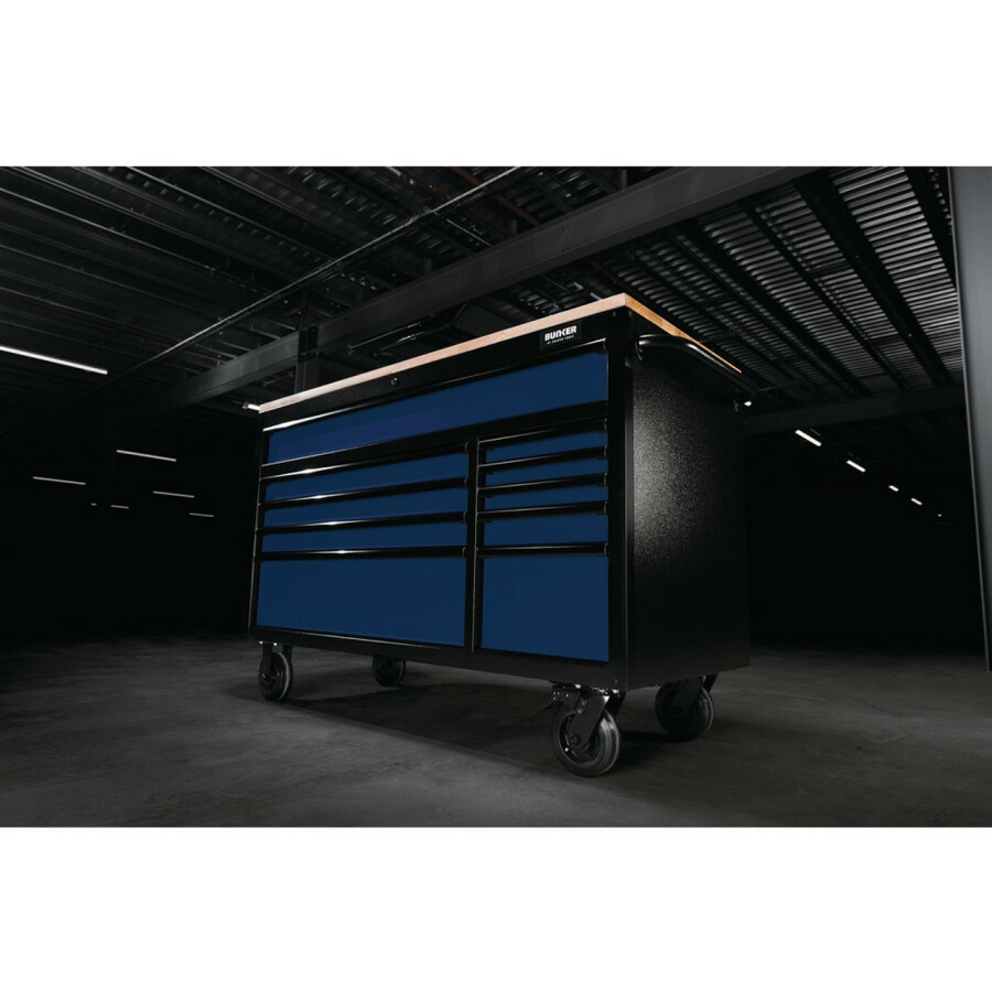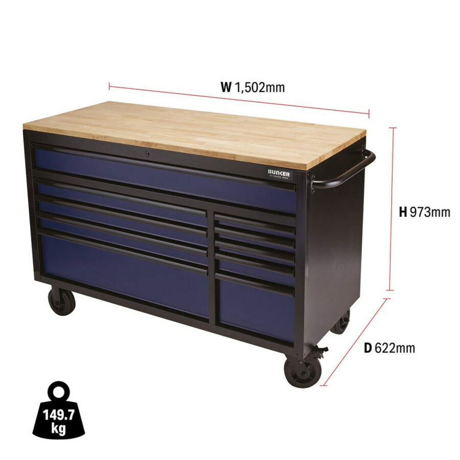 Onderdeel van het Bunker® opbergassortiment. Deze prachtig ontworpen 150 cm hoge kast van hoogwaardig staal heeft tien lades verfraaid met een stijlvolle zwart geanodiseerde aluminium rand. Elke lade heeft een soepele softclose-bediening en is bekleed met weelderig schuim om je gereedschap te beschermen. De matblauwe structuurafwerking van de kast is zeer duurzaam, dankzij de industriële poedercoating die beschermt tegen krassen, slijtage en corrosie, voor een handige werkruimte. Voor een gemakkelijke wendbaarheid is er een stalen handgreep en vier duurzame zwenkwielen. Twee van de wielen zijn voorzien van remmen om de gereedschapskast stil te houden. Het heeft een integraal slot voor veiligheid en wordt geleverd met twee sleutels. Het apparaat moet gedeeltelijk worden gemonteerd en heeft de afmetingen Breed 1.502 x Hoog 973 x Diep 622 mm. Voor uw kwaliteitsborging bieden alle Bunker®-units een garantie van 10 jaar.