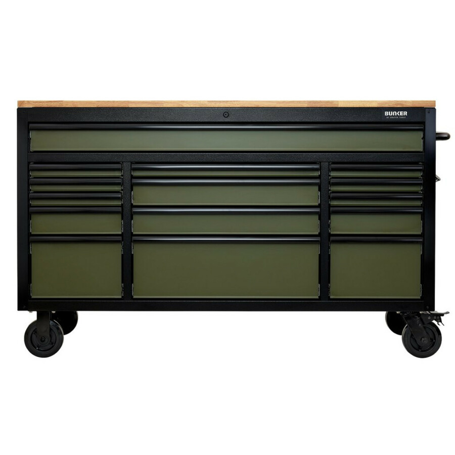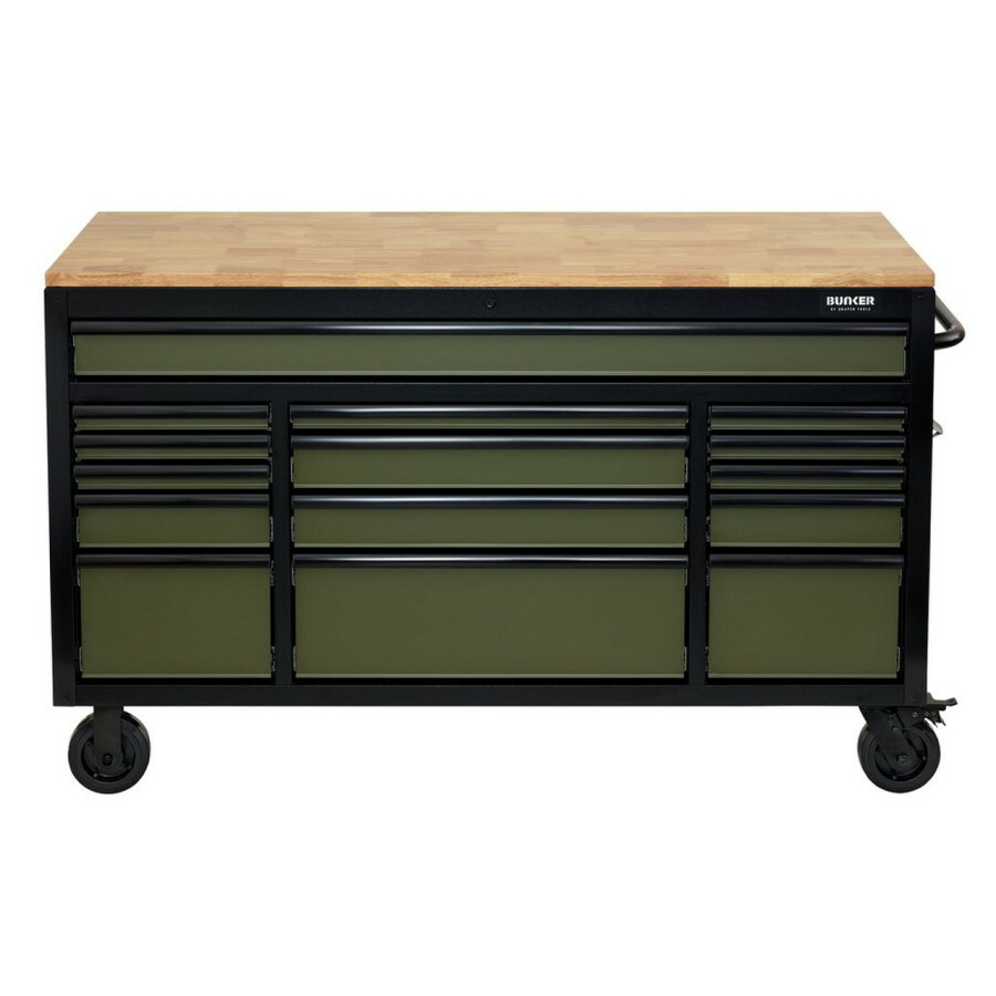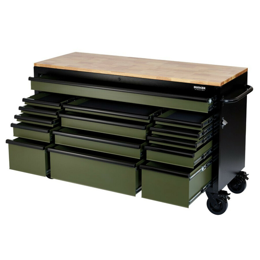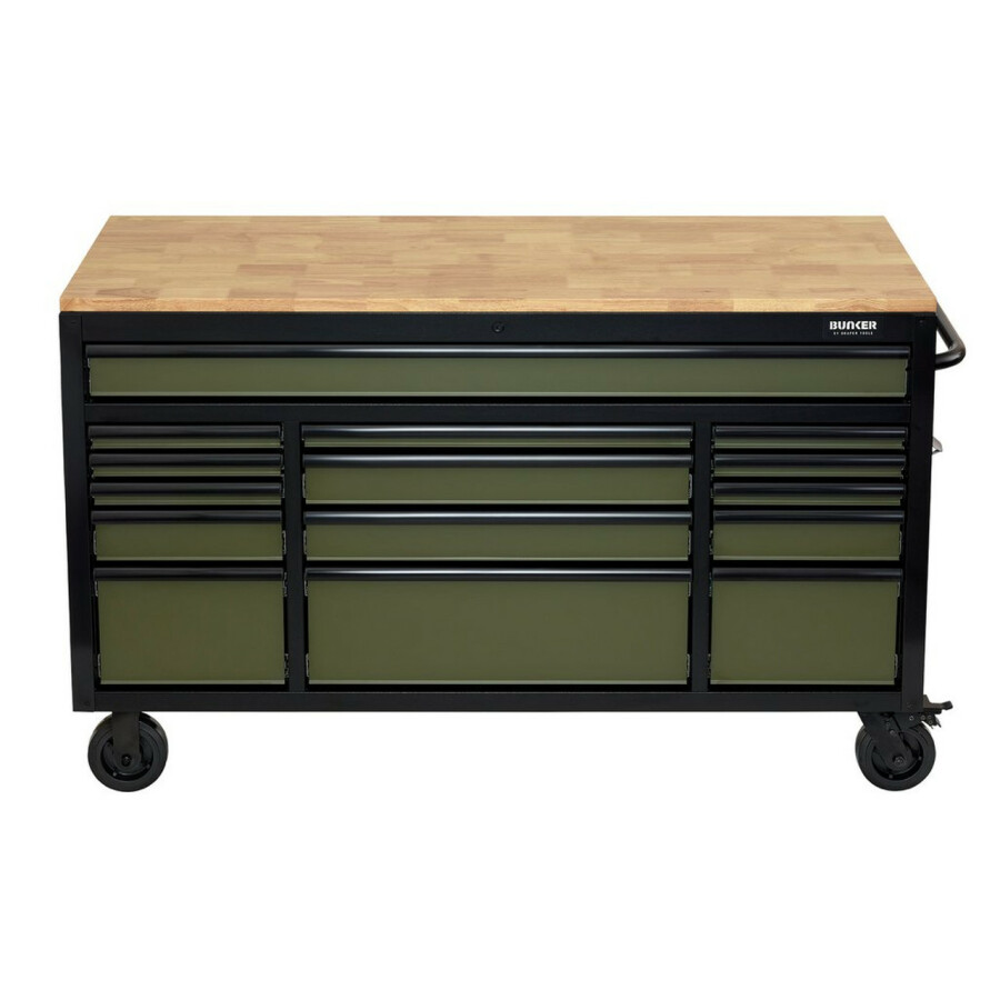 Onderdeel van het Bunker® opslagassortiment. Deze verbluffend ontworpen 61" stalen unit van topkwaliteit heeft 15 laden versierd met een stijlvolle zwart geanodiseerde aluminium rand. Elke lade heeft een soepele soft-close-bediening en is bekleed met weelderig schuim om uw gereedschap te beschermen. De matgrijze structuurafwerking van de kast is zeer duurzaam dankzij de industriële poedercoating die beschermt tegen krassen, slijtage en corrosie. Dit is een verrijdbare kast, waardoor je nuttige spullen altijd bij de hand hebt waar je ze nodig hebt in de garage. Ingebouwde flesopener. Het 25 mm dikke hardhouten werkblad beslaat het hele oppervlak van de unit en biedt een handige werkruimte. Voor het gemak van manoeuvreren is er een stalen handgreep en vier duurzame zwenkwielen. Twee van de wielen zijn voorzien van remmen om het gereedschap op zijn plaats te houden. Het heeft een geïntegreerd slot voor de veiligheid en wordt geleverd met twee sleutels. De unit vereist gedeeltelijke montage en meet B 1.631 x H 974 x D 584 mm. Voor uw kwaliteitsborging hebben alle Bunker®-units een garantie van 10 jaar.
