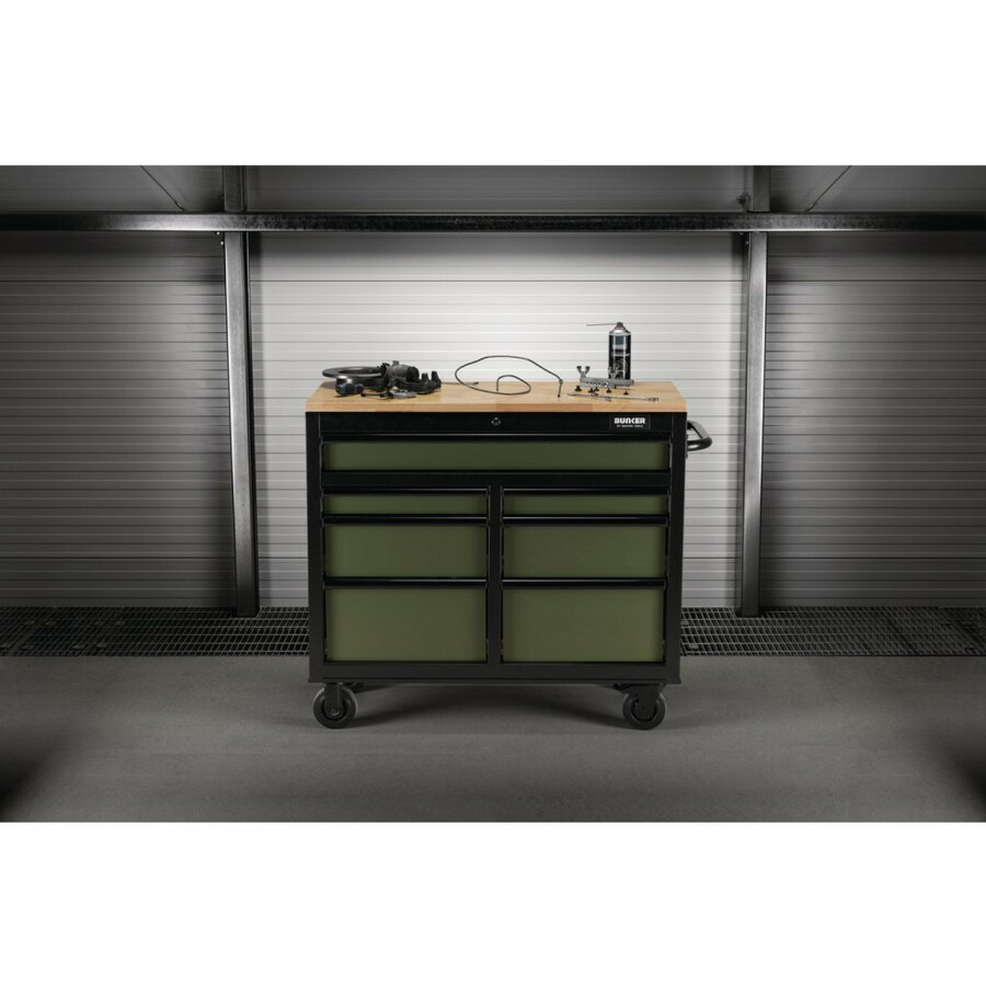 Bunker® werkbank gereedschapskast, 7 laden, 41", groen nr. 08221 Onderdeel van het Bunker® opbergassortiment. Deze prachtig ontworpen 41-inch stalen kast van topkwaliteit heeft zeven lades verfraaid met een stijlvolle zwart geanodiseerde aluminium rand. Elke lade heeft een soepele soft-close-bediening en is bekleed met weelderig schuim om je gereedschap te beschermen. De matgroene textuurafwerking van de kast is zeer duurzaam, dankzij de industriële poedercoating die beschermt tegen krassen, slijtage en corrosie. Dit is een mobiele kast, zodat je nuttige spullen overal bij de hand hebt in je garage. , voor een handige werkruimte. Voor een gemakkelijke wendbaarheid is er een stalen handgreep en vier duurzame zwenkwielen. Twee van de wielen zijn voorzien van remmen om de gereedschapskast stil te houden. Het heeft een integraal slot voor veiligheid en wordt geleverd met twee sleutels. Het apparaat moet gedeeltelijk worden gemonteerd en heeft de afmetingen breed 1.122 x Hoog 951 x Diep 461 mm. Voor uw kwaliteitsborging bieden alle Bunker®-units een garantie van 10 jaar.