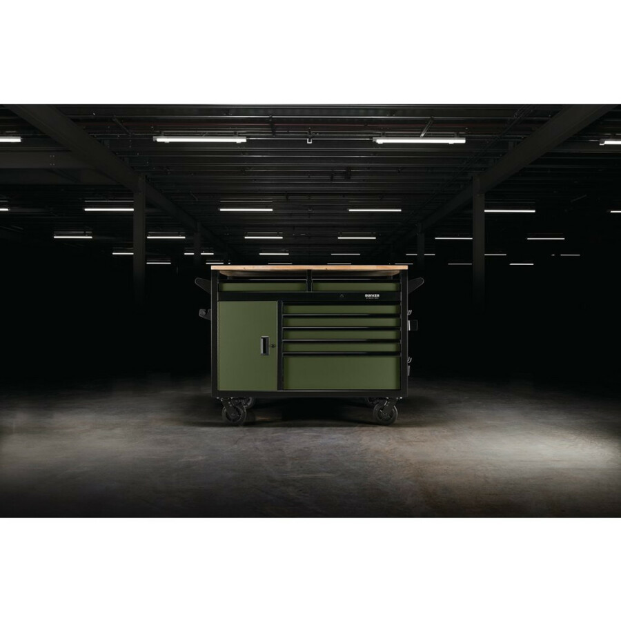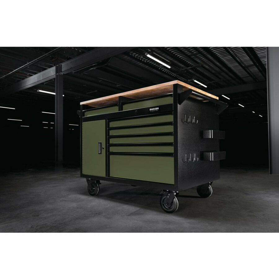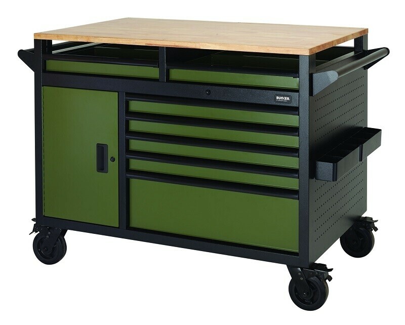 Omschrijving De 122 cm brede Bunker multifunctionele werkbank met 14 laden en gereedschapskast, verkrijgbaar in grijs of groen, biedt diverse functies om uw werkruimte te verbeteren. Deze veelzijdige unit is ontworpen voor professionals en hobbyisten en beschikt over 14 laden, een ruim 25 mm dik werkblad en een dubbelzijdige opbergkast met een interne plank. De industriële poedercoating met structuur zorgt voor duurzaamheid en beschermt tegen krassen, slijtage en corrosie. Twee zijpanelen zijn voorzien van pastborden, ideaal voor het ophangen van gereedschap. Extra gereedschap en accessoires, waaronder onze ophangbak en papieren handdoekdispenser. Elke lade sluit soepel met een soft-close mechanisme en is bekleed met zacht schuim om uw gereedschap te beschermen. Het 25 mm dikke hardhouten werkblad beslaat het gehele oppervlak en biedt een robuuste werkruimte. Voor eenvoudige verplaatsing is de kast voorzien van een stalen handgreep en vier duurzame zwenkwielen, waarvan er twee zijn voorzien van remmen om de kast stevig op zijn plaats te houden. Een geïntegreerd slot zorgt ervoor dat uw gereedschap veilig is opgeborgen en de kast wordt geleverd met twee sleutels voor extra beveiliging. Bunker rolkasten voor gereedschap worden op pallets verzonden. Door de hoogwaardige constructie zijn sommige producten zwaar en vereisen ze twee personen om te tillen.