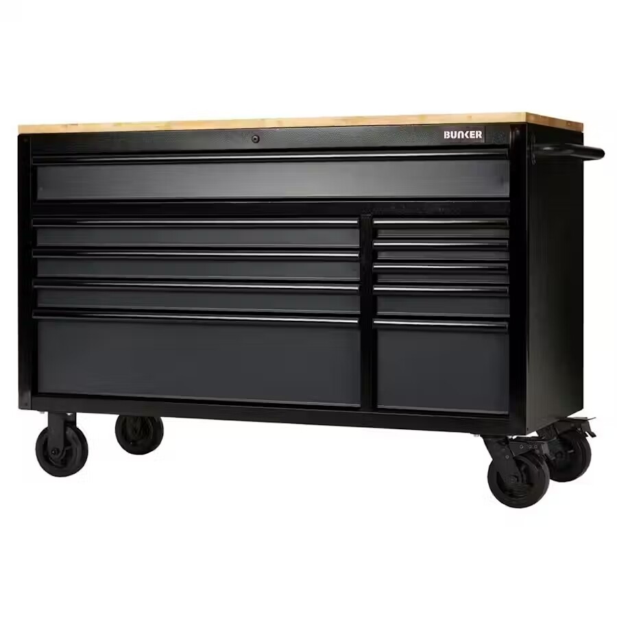 De 142 cm brede Bunker werkbankgereedschapskast op wielen met 10 laden, Kleur grijs is ontworpen voor optimale gereedschapsopslag. Ideaal voor zowel thuis als op het werk, met een matte, beschermende afwerking die krassen en slijtage tegengaat, tien laden en een strakke, zwart geanodiseerde aluminium afwerking. Elke lade is voorzien van een soepel soft-close mechanisme en een Eva schuimvoering om uw gereedschap te beschermen wanneer het niet in gebruik is. De 56 inch gereedschapskist is ontworpen met mobiliteit in gedachten en is voorzien van een stevige stalen handgreep en vier robuuste zwenkwielen, waardoor u hem gemakkelijk tussen werkplekken kunt verplaatsen en uw gereedschap altijd binnen handbereik hebt. Voor extra veiligheid is hij uitgerust met een geïntegreerd slot en twee sleutels. Met een 25 mm dik hardhouten werkblad fungeert deze 56 inch rolkast met gereedschapskist tevens als functioneel werkstation, ideaal voor precisiewerk, montage en dagelijkse klussen. Begin uw carrière met Bunker en til uw werkplek naar een hoger niveau met een duurzame gereedschapsoplossing. Bunker rolkasten worden op pallets verzonden. Door de hoogwaardige constructie zijn sommige producten zwaar en vereisen ze twee personen om ze te tillen.