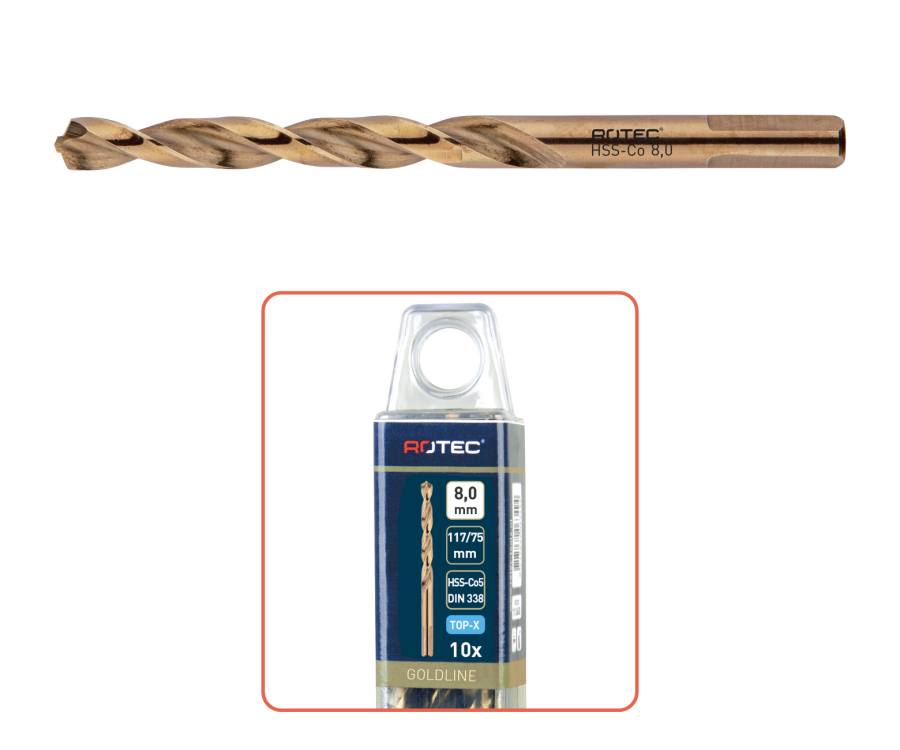 Uitvoering HSS-E spiraalboor, Din 338, type N spiraal, geslepen uitvoering, kruisaanslijping volgens Din 1412-C, tophoek 135° en cilindrische schacht. Vanaf ø 4 met 3-vlaksopname voor optimale klemming in boorkop. Zeer geschikt voor gebruik in accu-boorschroefmachines. Snel en precies aanboren zonder centreren, meer boren met 1 acculading door de gereduceerde snijkrachten, zuivere en ronde gaten, ook in plaatmateriaal.