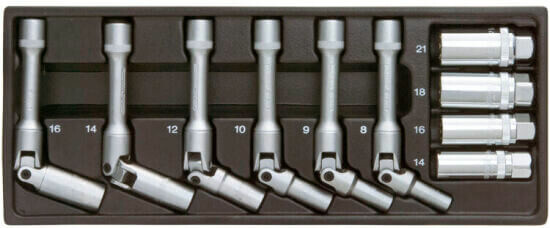 Complete set tbv montage en demontage van bougies en gloeibougies Recht 12-kant : 14 -16 -18 - 21 mm Met kniegewricht 6-kant : 8 - 9 -10-12-14-16 mm