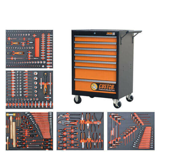 Omschrijving De Custor CTB99069 is een robuuste en professioneel uitgeruste gereedschapswagen met 7 ruime laden, waarvan 5 laden gevuld zijn met een uitgebreid assortiment aan gereedschapsmodules. Ideaal voor intensief gebruik in veeleisende werkomgevingen waar efficiëntie en overzicht centraal staan. 7 kogelgelagerde laden met soft-close systeem 5 gevulde laden met hoogwaardige modules: o.a. schroevendraaiers, sleutels, doppen, tangen en speciaalgereedschap Sterke stalen constructie met slijtvaste poedercoating Centraal slot + individuele ladevergrendeling voor veiligheid en stabiliteit Zwenkwielen met remmen en ergonomische duwbeugel voor maximale wendbaarheid Perfect voor professionele werkplaatsen, onderhoudsdiensten en technische afdelingen Direct inzetbaar voor montage, service en reparatiewerkzaamheden