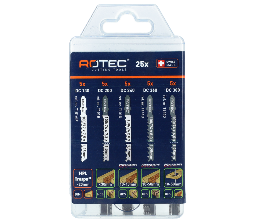 Uitvoering : 25 delige set met diverse types decoupeerzaagbladen voor een groot en divers inzetgebied verpakt in een handige kunststof cassette. Set met diverse types decoupeerzaagbladen voor een groot en divers inzetgebied verpakt in een handige kunststof cassette. Artikelnummer : 03.520.9000Specificaties 25-delige set decoupeerzaagbladen voor hout en metaal 5x 03.520.0130 DC 130 : Hard hout, Trespa, Laminaat, gecoate platyen, HPL 2-30 mm GVK Epoxi 0- 30 mm Geen splinters 5x 03.520.0200 DC 200 : Zacht hout , spaan-meubel en vezelplaten 3-30 mm, kunstoffen 30 mm 5x 03.520.0240 DC 240 : Zacht hout, spaan-meubel en vezelplaten 10-45 mm 5x 03.520.0360 DC 360 : Zacht hout, 5-50 mm spaan-meubel en vezelplaten 10-45 mm 5x 03.520.0380 DC 380 : Zacht hout, 5-50 mm spaan-meubel en vezelplaten speciaal voor het zagen bochten Verpakking : handige kunststof cassette