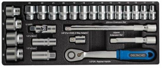 Omschrijving De Deltach M-module 120025 is een complete 25-delige doppenset met 1/2" aansluiting, overzichtelijk geplaatst in een duurzame kunststof inlage van M-formaat. Deze set biedt een uitstekende balans tussen functionaliteit en ruimtebesparing, perfect voor gebruik in werkplaatsen, servicewagens en gereedschapswagens. Geleverd in oliebestendige kunststof inlay M formaat Voor een georganiseerde lade-indeling Gemaakt van hoogwaardig chroom-vanadiumstaal. Slijtvast en betrouwbaar Duidelijk gemarkeerde posities voor snel en efficiënt gebruik Inhoud : 25 delige 1/2 doppenset : Ratel, korte doppen 10-11-12-13-14-15-16-17-18-19-20-21-22-23-24-24-30-32 mm, bougiedoppen 16-21 mm, verlengstukken 125-250 mm, adaptor 3/8"-1/2", kniestuk