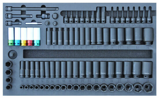Omschrijving De Deltach foam inlay met krachtdoppen biedt een complete en professionele set voor het werken met slagmoersleutels. De hoogwaardige krachtdoppen zijn geschikt voor zware belasting en veilig opgeborgen in een duurzame, op maat gesneden foam inlay geschikt voor de Deltach 525 serie. en de Custor serie CTB9907 en CTB9908 Compleet assortiment krachtdoppen geschikt voor 1/2" slaggereedschap Gemaakt van hoogwaardig Chroom Molybdeenstaal extreem sterk en slijtvast Mat zwarte afwerking voorkomt reflectie en biedt extra bescherming Stevige foam inlay schokabsorberend en perfect passend in gereedschapslades Ideaal voor gebruik met slagmoersleutels Alles overzichtelijk en snel toegankelijk Beschermt gereedschap én lade tegen beschadiging