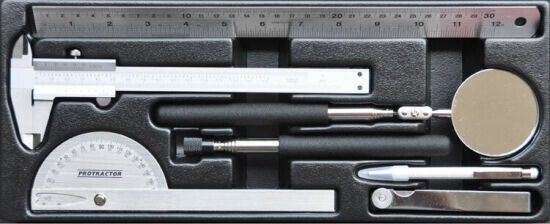 Inhoud : 7 delige Voorzien van RVS liniaal 30 cm, voelermaten set 20 delig, telescopische spiegel 57cm, Pick-Up Tool met magnetische kop tot 1.5 kg, Kraspen, Gradenboog en Schuifmaat.