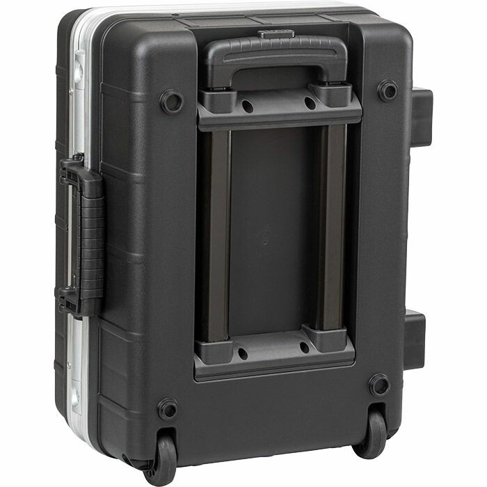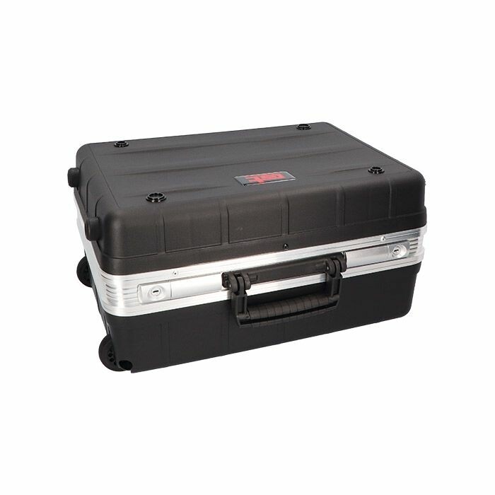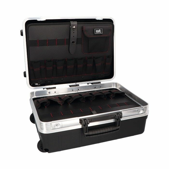 2 sloten met sleutel Robuust aluminium profiel Ergonomische handgreep met rubberen greep 3 achterscharnieren voor maximale weerstand Bodemgedeelte met verwijderbare/verstelbare tussenschotten 2 stuks gereedschapsvakken met flexibele gereedschapszakken Telescopisch handvat