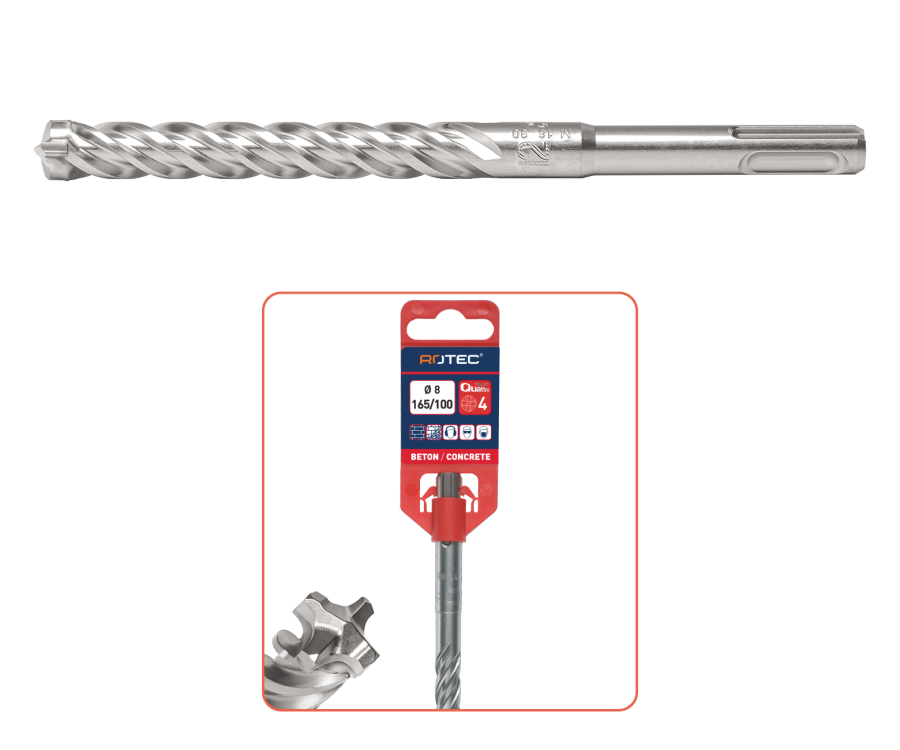 Omschrijving De Rotec SDS Plus Quattro-X 4-snijder hamerboren zijn ontwikkeld voor maximale prestaties en betrouwbaarheid bij zwaar boorwerk in beton en steen. Dankzij de geavanceerde 4-snijder hardmetalen kop boren deze hamerboren uiterst nauwkeurig en blijven ze stabiel, zelfs bij contact met wapening. De Quattro-X geometrie zorgt voor een perfecte rondloop en voorkomt vastlopen in het materiaal. Hierdoor ontstaat een snelle, gecontroleerde boorprogressie met minder trillingen en een hogere maatnauwkeurigheid. De robuuste spiraalconstructie garandeert een optimale afvoer van boorstof en een efficiënte krachtoverbrenging via de SDS-plus aansluiting.