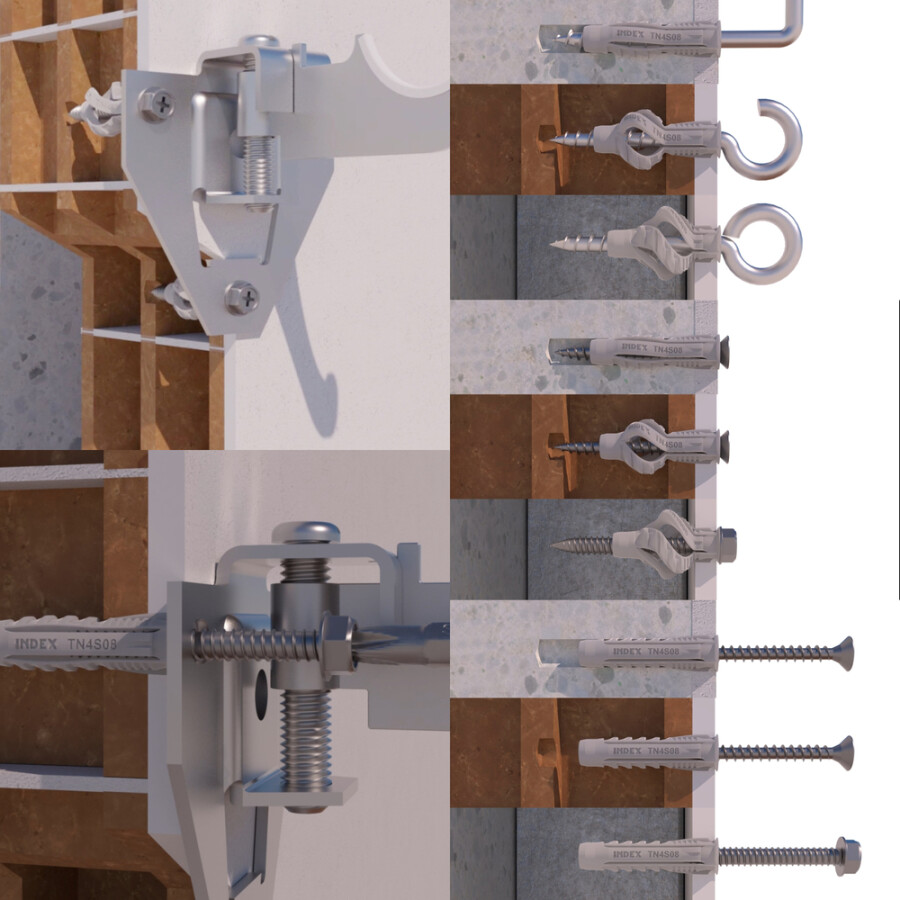 Toepassingen Ideaal voor het bevestigen van: Wand- en plafondsteunen, leuningen, kabelgoten Sanitair wastafels, toiletten TV-beugels, consoles, rekken Armaturen, profielen en andere installaties
