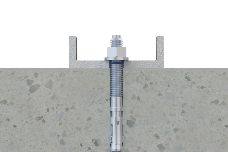 Boor een gat met de juiste diameter en diepte conform technische fiche. Verwijder stof uit het boorgat. Plaats het anker door het montagestuk heen in het boorgat. Sla in met een hamer totdat het anker volledig in het beton zit. Draai aan met een momentsleutel tot het voorgeschreven aandraaimoment is bereikt. Afmetingen Materiaal : Staal Verzinkt voorzien van A4 clip Afmeting : 12 x 100 mm Klembereik : 4 mm Boordiameter :12 mm