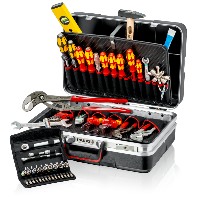 Omschrijving Bestaat uit 52 merken gereedschappen, deels VDE-gekeurd overeenkomstig Din EN 60900 Max. belasting: 20 kg Inhoud van 27 liter Voor omvangrijke werkzaamheden in sanitair en huishoudtechniek Flexibele vormingsmogelijkheden door individueel verdeelbare inzetstukken in de 60 mm diepe bodembak en diens afdekstuk met zes grote gereedschapstassen Stabiele rasterscharnieren houden het deksel ondanks het eigengewicht van de gereedschappen wanneer nodig open Stevige, ergonomische draaggreep, klikt vast onder een hoek van 90° Uitneembaar gereedschapsbord met 15 gereedschapstassen op de onderkant en zes gereedschapstassen en een klemvak 400 mm breed aan de kant van het deksel, vastgehouden met een drukknop Twee afsluitbare stalen kipsloten beschermen de inhoud van de koffer tegen diefstal Rondlopend dubbel aluminium frame Stevige uitvoering van ABS-materiaal, zwart Afdek- en gereedschapsborden van vuilwerende PP-kanaalplaat Buitenafmetingen : 480 x 380 x 200 mm. Binnenafmetingen : 460 x 310 x 190 mm