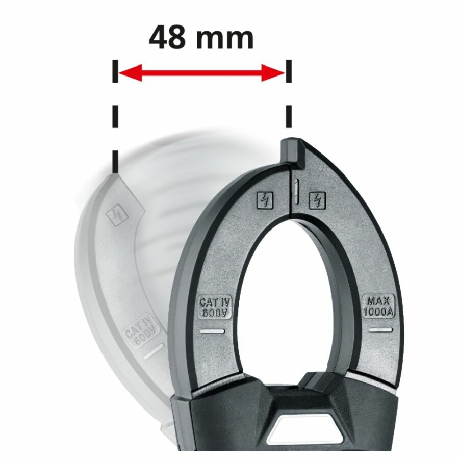 Specificaties Stroomtang-multimeter Gelijk-/wisselspanning Gelijk-/wisselstroom Weerstand Doorgangstest met signaalgeluid Automatische bereiksomschakeling Peak/Hold Min/Max RMS Eenpolige fasetest Numerieke digitale weergave Gegevensoverdracht Ledverlichting Veiligheidsklasse II, Dubbele isolatie Overspanningscategorie : CAT III – 1000 Volt CAT IV – 600 Volt Display : 0 … 50000 Balkdiagram Interface Digital Connection Stroomvoorziening : 1 x 9 Volt 6LR61 Temperatuur : 5°C … 40°C