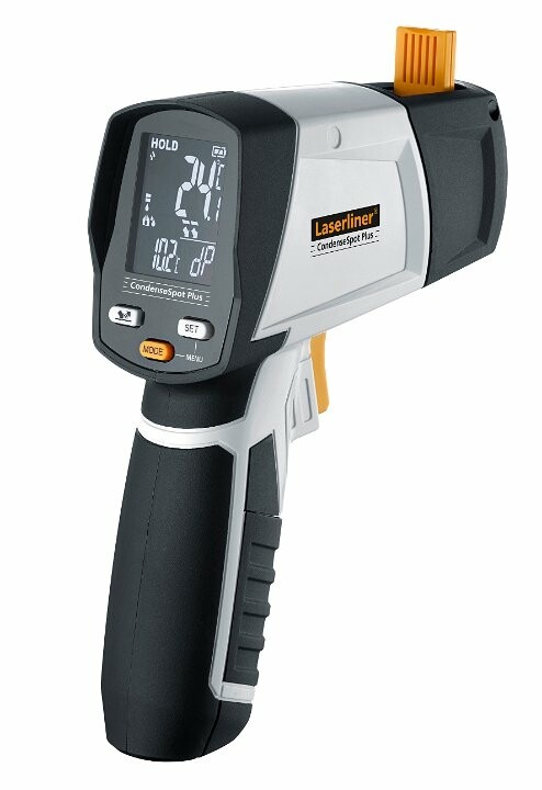 Omschrijving Infraroodthermometer voor het lokaliseren van koudebruggen en condensatie De CondenseSpot Plus is geschikt om schade aan het bouwweefsel te voorkomen door koudebruggen en condensatie op te sporen. De infrarood thermometer bepaalt de oppervlaktetemperatuur, omgevingstemperatuur, relatieve vochtigheid en dauwpunttemperatuur. Temperatuurmeting is ook mogelijk op moeilijk bereikbare plaatsen en in gevaarlijke meetzones. Het praktische multifunctionele display toont tegelijkertijd verschillende meetwaarden.