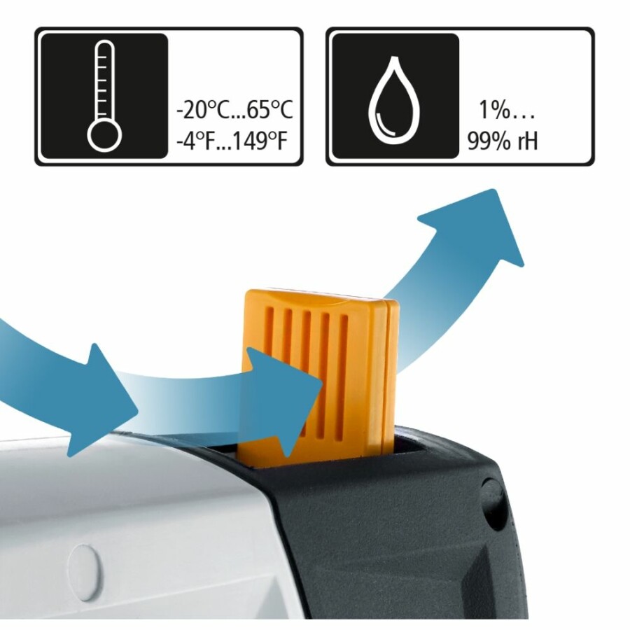 Effectieve lokalisatie van koudebruggen en condensatievocht door contactloze temperatuurmeting Breed scala aan meetopties: oppervlaktetemperatuur, omgevingstemperatuur, relatieve vochtigheid, dauwpunt, natte en droge temperaturen Maakt temperatuurmeting op moeilijk bereikbare plaatsen en in gevaarlijke meetzones mogelijk Uitgebreide informatie door gelijktijdige weergave van verschillende meetwaarden Condenswaterindicator als staafdiagramweergave Duidelijke koudebrugwaarschuwing met kleurendisplay Praktische weergave van de kleinste, grootste of differentiële meetwaarde Snelle selectie van standaard emissiewaarden door snelle voorinstelling Exacte aanpassing van de emissiviteit door numerieke invoer K-type alarmfunctie Laatste meetwaarde kan tijdelijk worden opgeslagen Gemakkelijk af te lezen LC-display Stevige, ergonomisch ontworpen behuizing