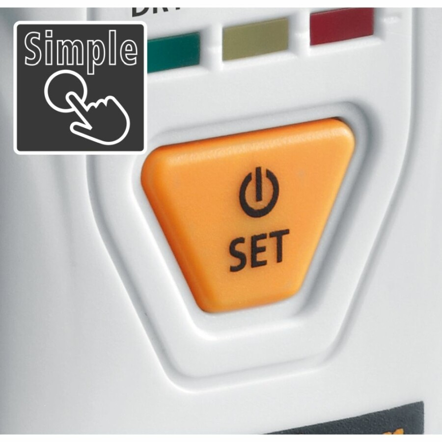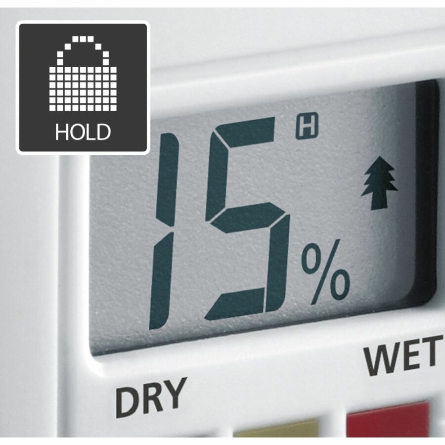Effectieve vermindering van energie en verontreinigende stoffen door nauwkeurige bepaling van de droogtegraad van brandhout Nauwkeurige controle van het vochtgehalte voor zachte bouwmaterialen Meet de omgevingstemperatuur Hold-functie voor het vergrendelen van de huidige meetwaarde op het display Led-indicator nat/droog
