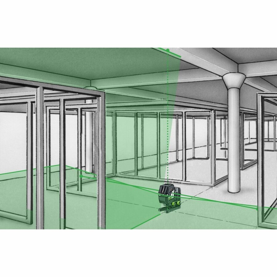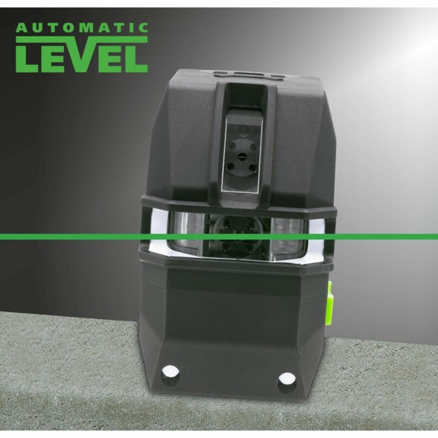 Omschrijving Deze kruislijnlaser met groene-lasertechnologie overtuigt met zijn fel laserkruis voor de exacte uitlijning van horizontale en verticale lijnen en hellingen. De laser projecteert ook twee punten aan de zijkant en twee loodpunten. Deze punten zijn zeer goed zichtbaar en staan in een hoek van 90° ten opzichte van elkaar. Dit maakt efficiënt loden mogelijk, zelfs in gebouwen met zeer hoge ruimtes. Met de laserpunten aan de zijkant kunnen markeringen eenvoudig van muur naar muur worden overgebracht, bijvoorbeeld bij het schilderen, het uitlijnen van houten panelen of een elektrische installatie. Met de klem- en wandhouder kan de laser worden opgehangen, veilig op metalen oppervlakken geplaatst of aan plafondprofielen aangebracht worden. De fijnafstelling opzij maakt een exacte, verticale afstelling van de laserlijnen op randen van voorwerpen mogelijk.