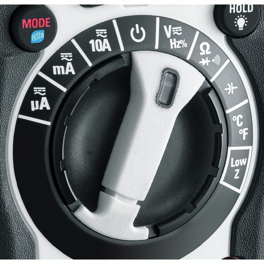 Specificaties Multimeter Gelijk-/wisselspanning Gelijk-/wisselstroom Weerstand Capaciteit Frequentie Temperatuur Diodetest Doorgangstest met signaalgeluid Tastgraad Low Z RMS Automatische bereiksomschakeling Min/Max Peak/Hold Gemiddelde waarde Numerieke digitale weergave Ledverlichting Gegevensoverdracht Veiligheidsklasse II, Dubbele isolatie Overspanningscategorie CAT III – 1000 Volt CAT IV – 600 Volt Display : 0 … 6000 Interface Digital Connection Stroomvoorziening : 4 x 1.5 Volt LR03 AAA Temperatuur : 0°C … 40°C