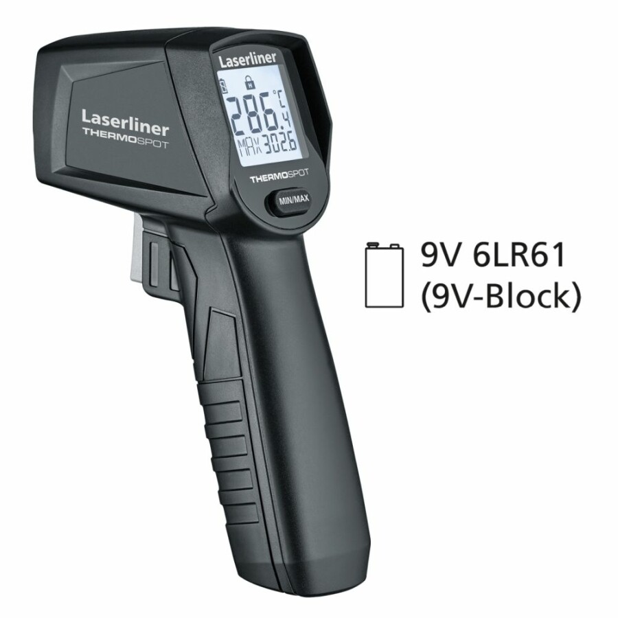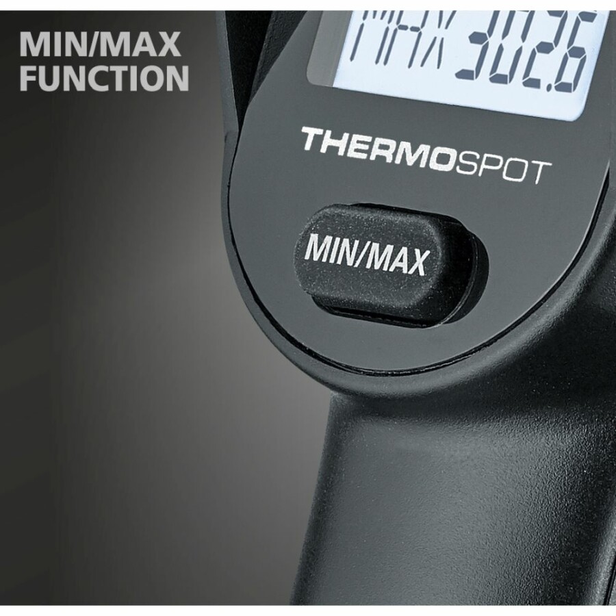 Nauwkeurige en contactloze detectie van oppervlaktetemperatuur Nauwkeurig richten van het inspectiegebied met de 8-punts lasercirkel Veilig meten in gevaarlijke toepassingen, bijvoorbeeld bewegende machineonderdelen Praktische weergave van de maximale meetwaarde tijdens het meten Korte termijn automatisch opslaan van de laatste meetwaarde Veelzijdige toepassing door groot temperatuurmeetbereik Infrarood thermometer Automatisch houden