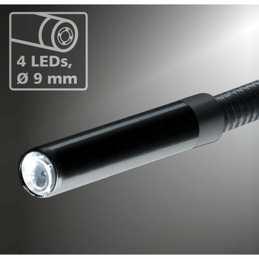 Omschrijving Het professionele video-inspectiesysteem maakt visuele controles mogelijk op plaatsen die moeilijk toegankelijk zijn, bijvoorbeeld in pijpleidingen, holle ruimten in muren en motorvoertuigen. De gebruiker kan zich eenvoudig ruimtelijk oriënteren door de basiseenheid op gevoel te draaien. De lange flexibele slang is geschikt voor gebruik op grote afstand. Met effectieve Led Objectverlichting zijn ook onder slechte omstandigheden zinvolle opnamen mogelijk. Dankzij een levensechte weergave van kleuren wordt een realistisch beeld geboden. Details kunnen duidelijk worden vastgelegd met behulp van de zoomfunctie. Het ergonomisch ontworpen apparaat ligt goed in de hand en is comfortabel in gebruik, zelfs tijdens langere werkzaamheden. Acht beschikbare talen en de verwisselbare camera-eenheid zorgen voor veelzijdige toepassingsmogelijkheden. Een SD-geheugenkaart wordt gebruikt voor de documentatie en de USB-C-interface voor de evaluatie van de beelden en video's.