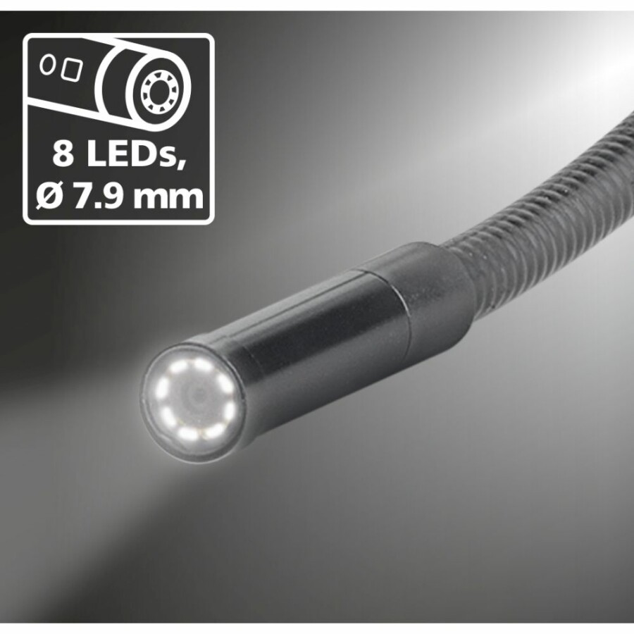 Omschrijving Video-Inspectiesysteem met hoge resolutie HD FlexCamera 1.5 meter magneethouder, magneet en haakhulpstuk, micro SD kaart Effectieve probleemlokalisatie dankzij een canera met hoge resolutie en een 1:1 weergave zonder kwaliteitsverlies Camerakop en sonde resistent tegen benzine en diesel. Effectieve probleemlokalisatie achter of in voorwerpen, wanden, leidingen, holle ruimten Zeer gedetailleerde beeld- en video-opnames dankzij een camera met hoge resolutie en een 1:1-weergave op het display zonder kwaliteitsverlies Extreem duidelijke digitale zoom dankzij de hoge resolutie van de camera De gebruiker heeft, dankzij de magnetische standaard aan de basiseenheid, beide handen vrij voor de positionering van de camera-eenheid Intensieve objectverlichting aan de camera dankzij 6 hoogrendements-leds Camerakop en -sonde resistent tegen benzine en diesel Natuurgetrouwe kleuren voor een realistische weergave Optimale contrastweergave van grijsschakeringen Beeld op de monitor staat dankzij rotatie en spiegeling altijd op de passende wijze ter beschikking Webcam-functie voor de livestream van de inspectie op de pc, ideaal voor stationair bedrijf in de industrie Lange bedrijfsduur dankzij krachtig HighCapacityPack met lithium-ionen-technologie Goed herkenbare, gekleurde weergave van de accu-laadtoestand Apparaat oplaadbaar met multinorm-netadapter of door het laden van het accupack in gedemonteerde toestand met een gebruikelijke USB-C-oplader Ook geschikt voor netvoeding Flexibele toepassingsmogelijkheden dankzij uitwisselbare camera-eenheid Innovatieve gebruikersinterface en individueel te programmeren toets aan de voorkant voor de comfortabele bediening Analyse en documentatie per micro-SD-kaart en USB-C-interface Mediagalerij met vermelding van datum en tijd van de opnames Tijdstempel: vaste kenmerking van elke opname met datum en tijd, onafhankelijk van het uitvoermedium Het toestel ligt dankzij een ergonomisch design goed in de hand Energiebesparende, automatische uitschakeling na een instelbare periode Specificaties Diameter kop : 7.9 mm Live-beeld Opname beeld/video Weergave beeld/video Digitale zoom Objectverlichting Real time-stempel Beelduitlijning Externe beeld-/video-uitgave Gegevensoverdracht Verwisselbaar accusysteem Diameter camerakop : 5 mm Resolutie camera : 1280 x 720 pixel Zichtveld : fov 80 Scherpte-diepte-bereik dof Front: 3 … 8 cm / Opzij: 2 … 5 cm Beeldschermtype : 5" TFT-display Resolutie display : 1280 x 720 pixel Fotoformaat : Jpeg Lengte sonde 2 meter Verlichting 5 helderheidsstanden Digitale zoom 2-voudige digitale zoom in stappen van 10% Geheugen Micro-SD geheugenkaart tot 32 GB Aansluitingen : USB type C Stroomvoorziening : Li-ion accupak 7.4 Volt / 2.6Ah / 19.24 Wh Netadapter : 9V/DC / 2A Afmetingen : 310 mm x 210 mm x 140 mm Gewicht 780 gram USB-C aansluiting Wordt geleverd in een kunststof draagkoffer Standaard toebehoren : Magnetische houder, Topclips, High CapacityPack Liion, Net/Laadtoestel inclusief adapter Usb-C kabel , Micro SDS Kaart