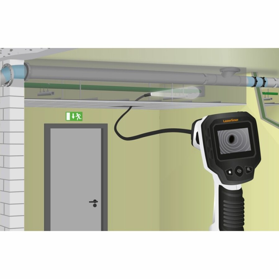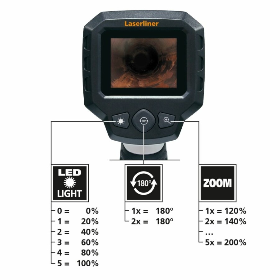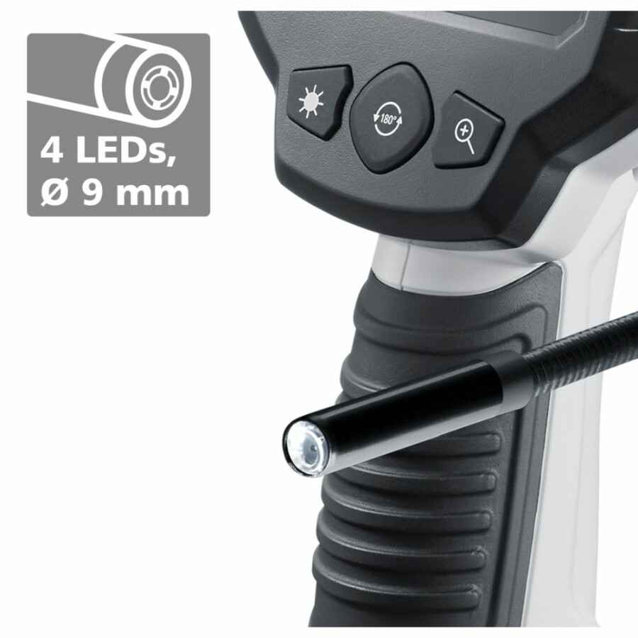 Eenvoudige probleemlokalisatie achter of in objecten, muren, leidingen, holtes Kleine camerakop, ideaal voor moeilijk bereikbare plaatsen Heldere beelden, zelfs onder de slechtste omstandigheden Waterdichte camerakop en kabel voor gebruik in sanitaire ruimtes Goede objectverlichting door 4 krachtige Led's Afbeelding duidelijk waarneembaar door rotatie en spiegeling Gemakkelijk af te lezen Lc-display