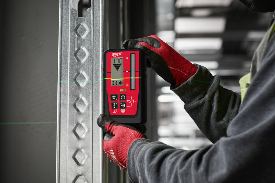 De Milwaukee® LRD100 ontvanger breidt de laserlijnfunctionaliteit uit tot 100 meter in combinatie met alle Milwaukee® kruislijn- en driedimensionale lasers Kan universeel gebruikt worden met roterende lasers tot 250 meter radius Het millimeterdisplay aan de voor- en achterzijde maakt een gemakkelijke en nauwkeurige detectie van de laserstraal mogelijk om het instelproces te verbeteren Detectie van rode en groene lasers voor veelzijdig gebruik Geleverd met 1x AA batterij en een materiaalklem om te bevestigen aan stang, draadeind, pijp of waterpas om de hoogte in te stellen IP67-geclassificeerd voor stof- en waterbescherming Sterke magneten aan de bovenkant van de ontvanger maken het mogelijk om gemakkelijk te bevestigen aan metalen oppervlaktes, ideaal voor hangende plafondinstallaties 5 instelbare nauwkeurigheidsinstellingen Led & audio indicatie om op afstand uit te lijnen Instelbare lijn voor efficiëntere laseropstelling