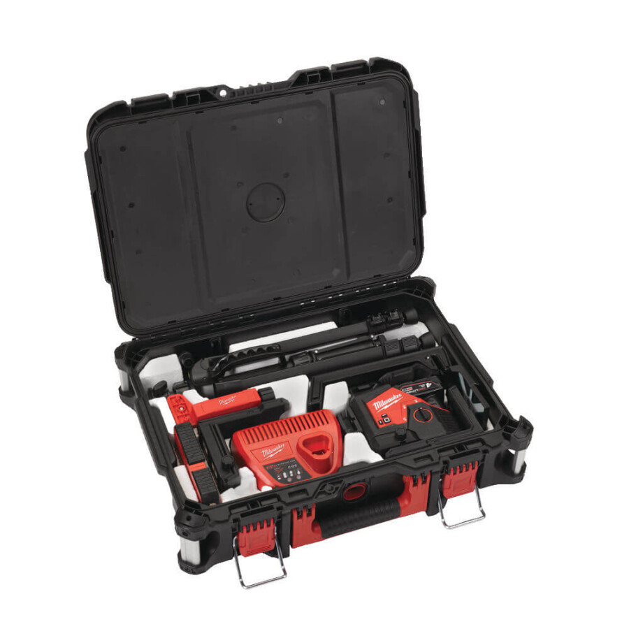 Specificaties Laserprojectie : 2x verticaal, 1 horizontaal Kleur laser : Groen Laserclassificaties : Klasse 2 Beschermingsklasse : IP54 Nauwkeurigheid : 0.3 mm Zelfnivelleringsbereik : 4 ° Compatibel laser ontvangen : LLD50 /LRD100 Max werkduur met M12B4 accu : 15 uur Werkbereik ontvanger : 50/100 meter Werkbereik zichtbaarheid : 38 meter Gewicht inclusief accu : 1.5 Kg Wordt geleverd met 1 x M12 B4 Accu-pack, C12 C Lader, Packout™koffer Standaard toebehoren : HIVIST, LLD50 afstandbediening, LM360 montagebeugel , TRP120 statief , montageclip