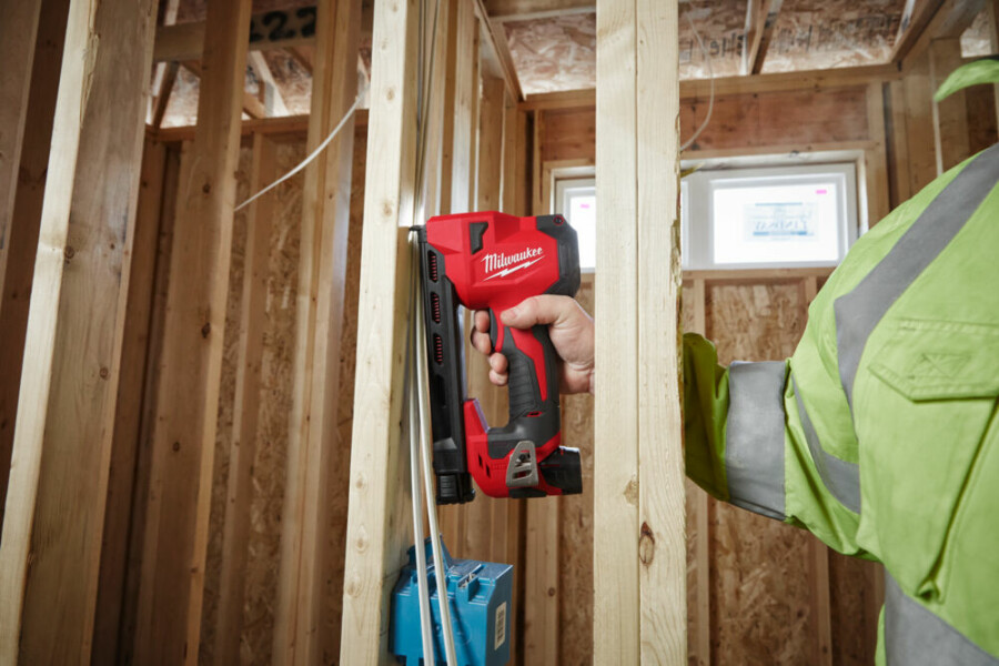 De nieuwe kabelnietmachine op accu is twee keer zo snel als een handmatige nietmachine. Het elimineert het grootste deel van het handmatig nieten van laagspanninskabel in hout Beweegbare kabelgeleiders zorgen voor een goede uitlijning over de kabel voordat ze over verschillende kabelformaten worden bevestigd Het compacte, lichtgewicht ontwerp biedt gebruikers een verbeterde ergonomie bij het nieten boven het hoofd of bij moeilijk bereikbare toepassingen De droogvuurblokkering voorkomt dat er geschoten wordt als er geen nietjes meer in het magazijn zitten Vermogen om nietjes van 25 mm adequaat in omlijstingsmateriaal te bevestigen Grote magazijncapaciteit met 45 nietjes voor minder uitvaltijd bij het herladen Led verlichting voor beter zicht op de werkplek Schiet tot 1200 nietjes per acculading met een Redlithium™ 2.0 Ah accu Omkeerbare riemclip stelt gebruikers in staat om te kiezen aan welke kant van de nietmachine ze de riemclip willen Premium 4-polige koolborstelmotor, Redlithium™ accupakket en Redlink™ elektronica leveren de nodige kracht, werkduur en duurzaamheid Flexibel accusysteem: werkt met alle Milwaukee® M12™ accu's