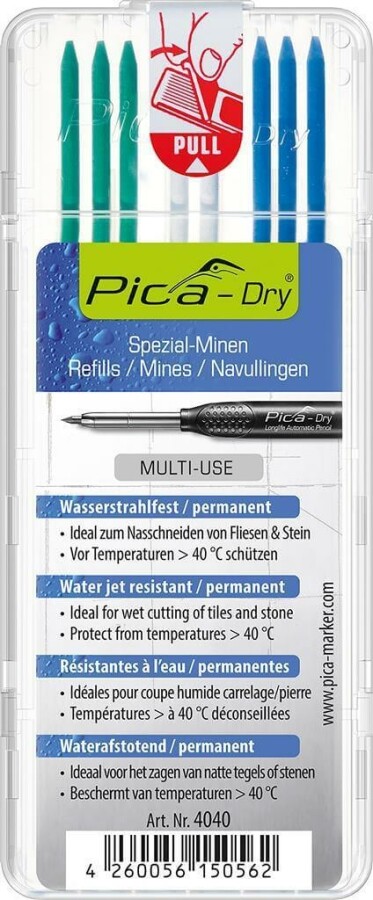 Omschrijving De Pica Dry is een professionele marker voor de bouw die geschikt is voor vrijwel elk materiaaloppervlak. Of het nu droog of nat, glad of ruw, stoffig of roestig is, met ons uitgebreide assortiment stiften ben je perfect voorbereid op elk project. Praktische kokerbeschermer met een speciale clip voor eenvoudige bediening met één hand Gepatenteerde, geïntegreerde slijper voor onmiddellijke precisie in de kokerbeschermer High-end drukmechanisme voor automatische loodtoevoer in een roestvrijstalen buis Vullingen 3 blauw, 2 wit, 3 groen kunnen eenvoudig aan de achterkant worden bijgevuld. Bewaardoosje is makkelijk te openen Wateroplosbare "multi-use" vullingen Geschikt voor bijna alle ondergronden: nat, droog, glad, ruw, stoffig, licht, donker of olieachtig Direct klaar voor gebruik. De vullingen zijn al geslepen Markeringen kunnen van gladde oppervlakken worden afgeveegd met behulp van een vochtige doek Bescherm de kleuren rood en geel tegen temperaturen boven de 30° Geschikt voor : metaal, glas, beton/steen, keramiek, laminaat,leder