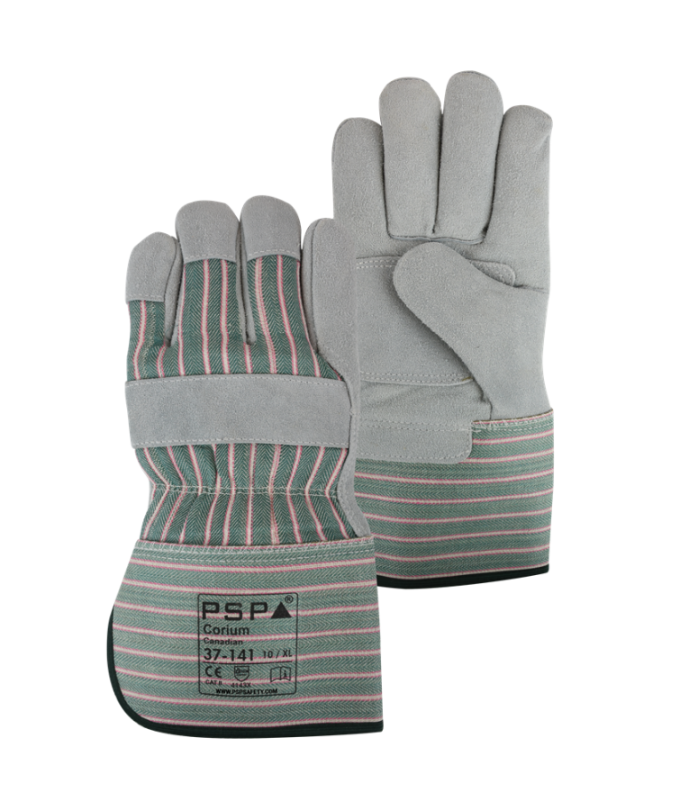 Omschrijving De PSP Corium Canadian 37-141 is een werkhandschoen, type “Amerikaantje”, gemaakt van eersteklas rundsplitleder. Soepel gelooid leder van 1.0 - 1.2 mm dikte. De handpalm heeft een trapezium versterking van 1.4 - 1.6 mm en voldoet daarmee aan de hoogste eisen. De handschoen is vrij van Chromium VI. Rug en kap zijn groen gestreept met een gerubberiseerde kap van 10 cm en goede molton voering in de handpalm voor extra comfort en vochtopname. Artikel PSP 37-141 is getest en gecertificeerd conform de Europese Verordening EU 2016/425 en de EN-normen EN420 / EN388:2016.