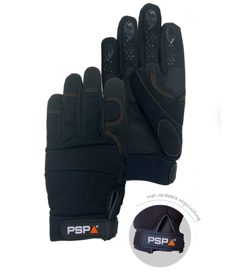 Omschrijving De PSP 39-510 Mechanic Grip Black Pro is een werkhandschoen, type “Mechanic”, welke bekend staat om de uitstekende grip,pasvorm en flexibiliteit. De voorgevomde handschoen is voorzien van palmversterkingen, welke beschermen tegen extraslijtage. De siliconen noppen op duim en vingers bieden u een uitmuntende grip. Deze werkhandschoen is vervaardigd uit synthetisch leder (microfiber) met een Spandex® rug, welke zorgt voor uitstekend, ademende eigenschappen. Het manchet is voorzien van een robuuste TPR sluiting voor extra comfort en bescherming. De verdekte wigsluiting zorgt voor een volledige sluiting om de pols. Deze -van hoog afgewerkte kwaliteit- werkhandschoen is zeer breed inzetbaar in verschillende werkomgevingen en vrije tijd. PSP 39-510 is getest en gecertificeerd conform de Europese Verordening (EU) 2016/425 en de EN-normen EN ISO 21420:2020 / EN388:2016.