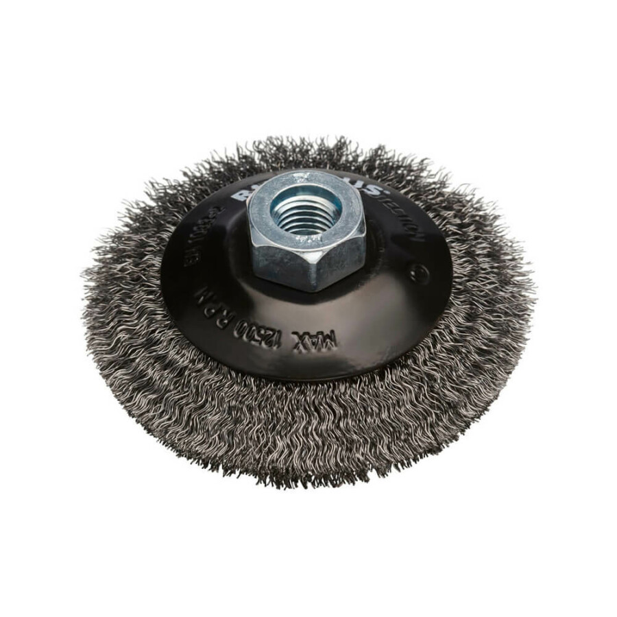 M14 aansluiting voor snelle montage op haakse slijpers Gegolfd RVS draad in combinatie met messing voor flexibel, corrosiebestendig en vonkarm werken De kegelvormige vorm is zeer geschikt voor moeilijk bereikbare hoeken, gaten en contouren Licht tot medium agressief werking en reinigen zonder krassen Vonkarm, corrosiebestendig, duurzaam Toepassing: Non-ferro metalen, RVS, messing en andere gevoelige materialenSpecificaties Kwaliteit : Pro-Line Materiaal : Staal verzinkt Soort draad : Gegolft Aansluiting : M14 Afmeting : 100 x 10 x 20 mm Draaddikte : 0.30 mm Toerental : 12500 Verpakking : 1 stuks